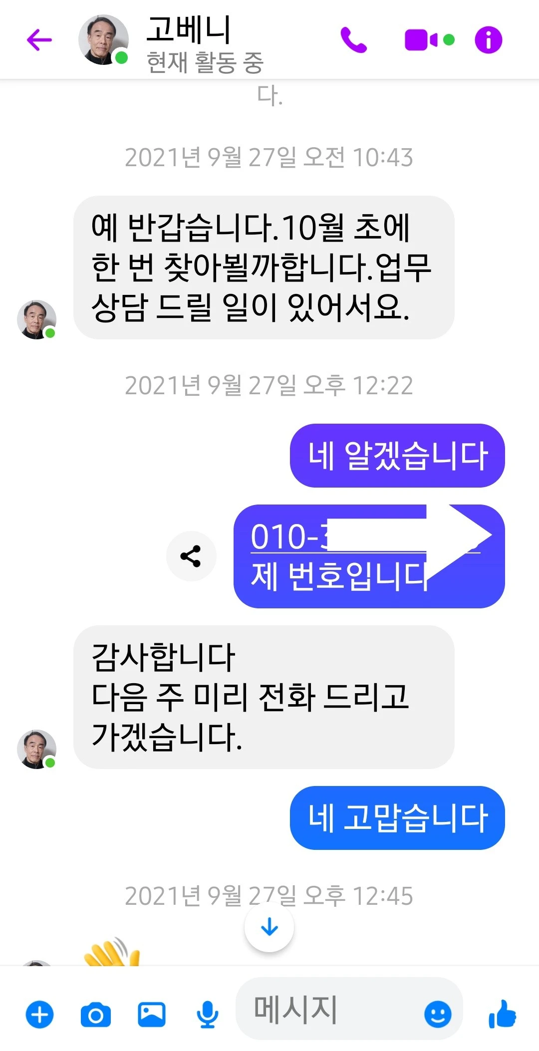 내용이 너무 멀리 왔다. 그래서 위쳇과 페이스북 메신저를 삭제하고, 2달쯤 지나선가 친구가 메시지 왜 안보냐고 전화가 와서, 다 보고 있다고 했더니 페이스북 메신저라고 이야기해서 할 수 없이 다시 페이스북 메신저를 연결하였는데, 역시나 또 다양한 사기 문자, 잘 알지도 못하는 사람들의 메시지가 와 있었는데, 그중 눈에 띈 것이 8월 7일 보낸 고베니라는 분의 메시지였다.
