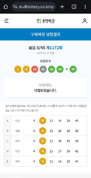 1172회 1등 당첨 번호가 “1, 9. 24, 40, 42, 44”