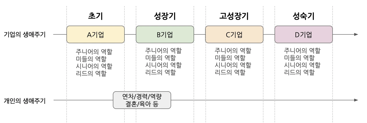 반대로 개인도 기업의 생애주기를 생각할 수 있어야 합니다. 기업도 창업 시기부터 투자를 받아 매출을 증명해야 하는 시기, 매출을 안정화하는 시기, 캐시카우를 기반으로 추가 동력을 확보해야 하는 시기 등 생애주기를 가지는데요. 그 생애주기에 따라 회사가 구성원에게 해줄 수 있는 지원이 있고, 해주고 싶어도 어려운 상황이 발생할 수 있습니다. 그래서 개인은 기업의 생애주기를 잘 보고, 나의 니즈와 기업의 니즈가 타이밍이 맞는지 잘 파악할 필요가 있습니다. 무엇보다 개인은 개인의 생애주기를, 기업은 기업의 생애주기를 스스로 잘 인지하는 게 가장 먼저입니다. 그래야 서로 윈윈 할 수 있습니다. 회사에서 적합한 역할이나 보상을 주지 않을 땐 내가 기대치를 충족하지 못했거나 역량이 부족한 건 아닌지도 냉정하게 살펴볼 수 있어야 합니다.