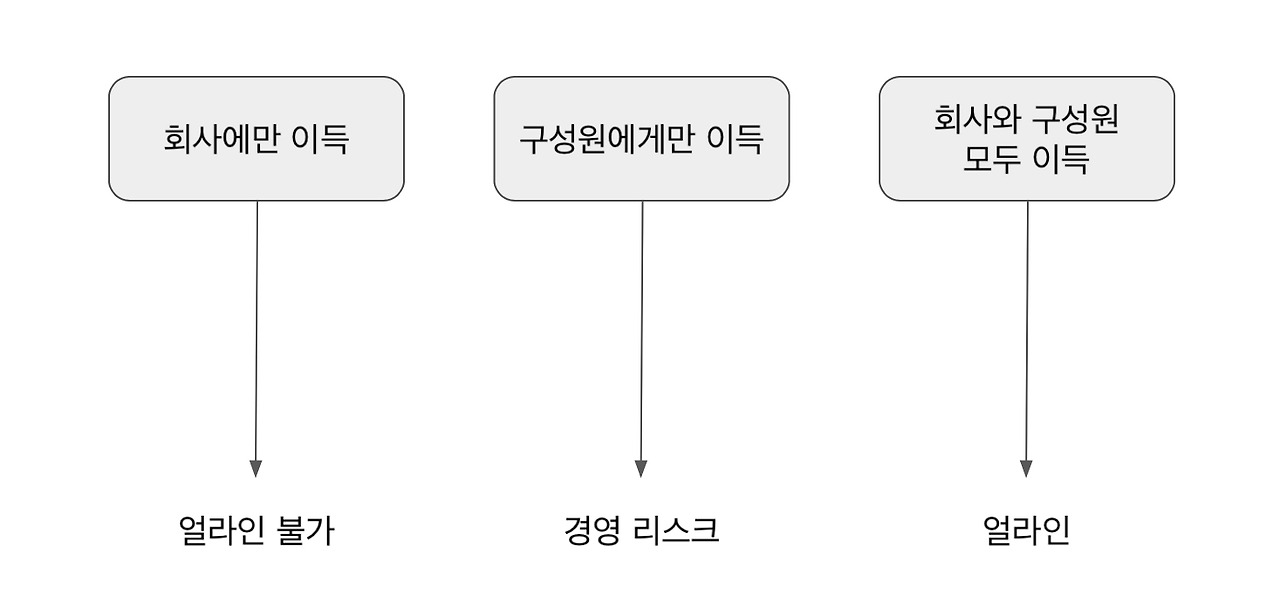 둘째는 이해 관계를 맞춰 주어야 합니다. 어떤 결정이 내려졌을 때, 왜 그렇게 하는지 이해가 되었더라도 나에게 이득이 없거나 오히려 나에게 손해를 입히는 결정이라면 얼라인하지 않으려 할 것입니다. 그렇기 때문에 탑에서 결정을 내렸고, 이를 구성원들이 수용하길 바란다면 그 결정이 구성원에게 어떤 이득으로 돌아올지에 대해서 각 리더들이 충분히 이야기할 수 있어야 합니다. 물론 가장 어려운 지점은 조직 전체적으론 이득인데 구성원 개개인 입장에서는 손해가 되는 상황에 처해 있을 때 입니다. 장기적인 조직 발전을 위해 현재 구성원들의 노력을 요구하는 것이라 얼라인 난이도가 매우 높을 수 있습니다.
