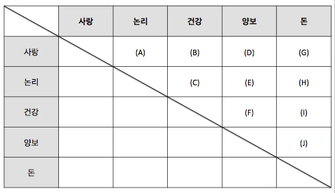- 사랑, 논리, 건강, 양보, 돈이라는 키워드가 나왔다고 가정해보자.