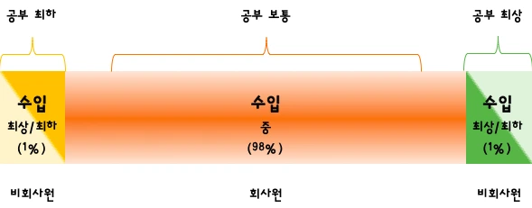 좀 극단적으로 표현하긴 했지만 현실을 반영한 그래프다. 회사원의 삶은 큰 돈은 벌지 못하지만 먹고 살 정도가 된다. 그리고 공부를 아주 잘 하거나, 아주 못했을 때는 모 아니면 도다. 거지 꼴로 살거나 사업이나 장사가 대박 터질 수 있다. 물론 일부 사람들은 공부를 최상으로 해도 중간이 되기도 하고, 공부를 어중간히 했는데 대박치는 사람도 있긴 하다. 평범한 직장인으로 남 아래서 일한다는 표현이 없어 보일 수 있지만 회사원이 가장 안정적이라는 것은 자명하다.