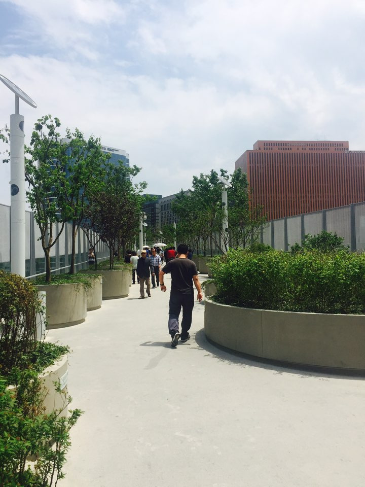 1번 출입로에 있는 경사로를 이용해 서울로 에 올라서면 이 길의 콘셉트가 한눈에 보입니다. 콘크리트 바닥과 콘크리트 화단, 조금은 건조하고 딱딱한 느낌의 길이 서울로를 대변하는 것이겠죠. 2만 4천 그루의 각종 식물들을 살펴보면서 걷는 길은 자칫 직진으로 그칠 수 있는 길을 잠시 잠깐 쉬어가는 산책로로 느껴지게 합니다. 다만 장애인들에게도 그럴까라는 염려는 여전히 지울 수 없습니다. 휠체어를 탄 것이 오히려 다른 사람들의 보행에 방해가 되지 않을까 걱정이 되는 좁은 길을 가는 것도 힘들고 드문드문 설치된 점자블록에 의지해 이 길을 가야 하는 시각장애인들에게는 단순한 육교의 기능조차 기대할 수 없을 것 같습니다. 시각장애인들에게 콘크리트 화분은 조심해야 하는 장애물이 되지 않을까 걱정이 되었습니다. 시각장애인을 위해서는 자원봉사자를 배치했다고 하는데 오히려 설계와 건축 과정에서 누구나 편히 걸을 수 있는 길을 만들었어야 하는 게 아닐까요? 그래야 서울시에서 자랑스럽게 얘기하는 진정한 '사람 길'이 되는 것이겠죠.