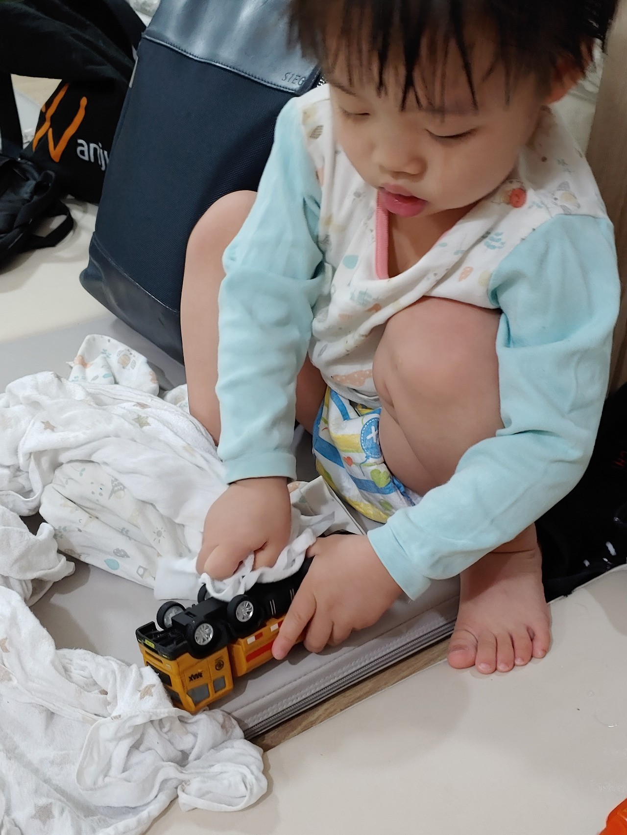 "서원이 쉬했어요? 음... 보니까 별로 안하는 것 같은데? 기저귀가 가벼워요."
