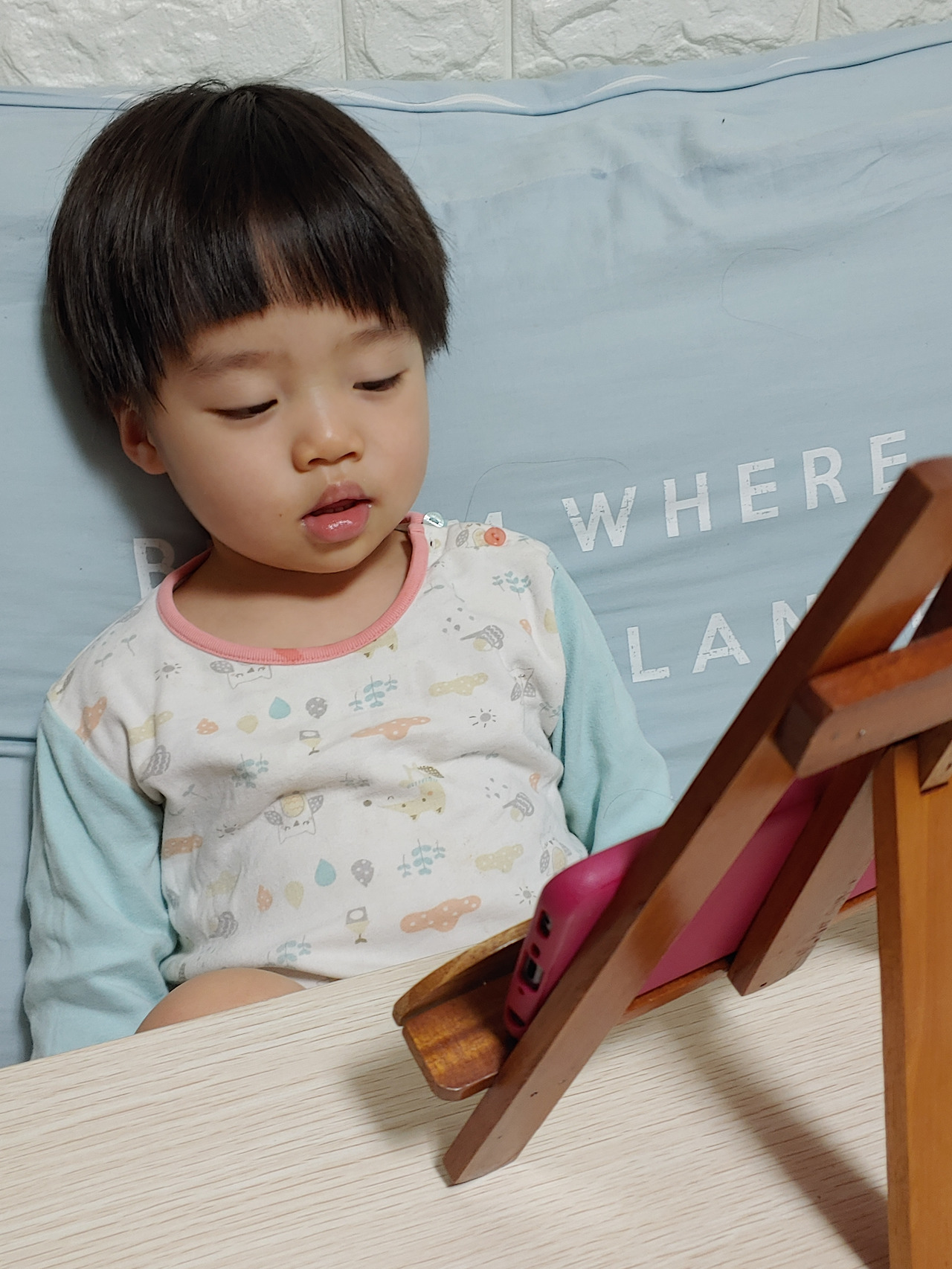 걱정되는 건 불편한 자세다. 바닥에 폰을 두고 앉아서는 고개를 숙이고는 한참이고 보는 터라 무척 신경이 쓰였다. 본인도 며칠 그렇게 해보니 목이 아픈지 고개를 위로 젖혔다 보기를 반복한다. 아기용 책상에 놓고 보라고 해도 몇 번 하는 시늉만 하고 도로 제자리다. "서원아. 목 아프지? 좀 쉬었다 보자." 했더니 듣는 척도 안 한다. 아 요 녀석 이거 어떻게 하지 두리번대다 아내가 침대에 누워 통화하고 있길래, "그럼 엄마처럼 누우세요." 했더니 냉큼 푹신한 베개 하나를 가져와서는 편하게 누워 핸드폰을 들고 본다. 그리고는,