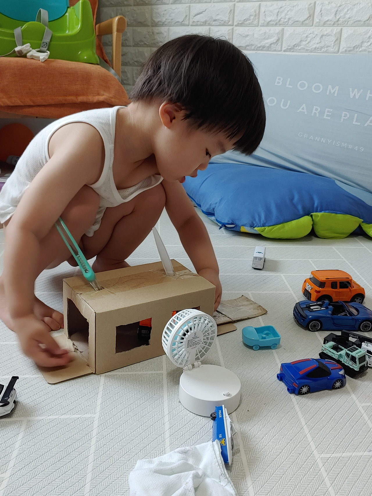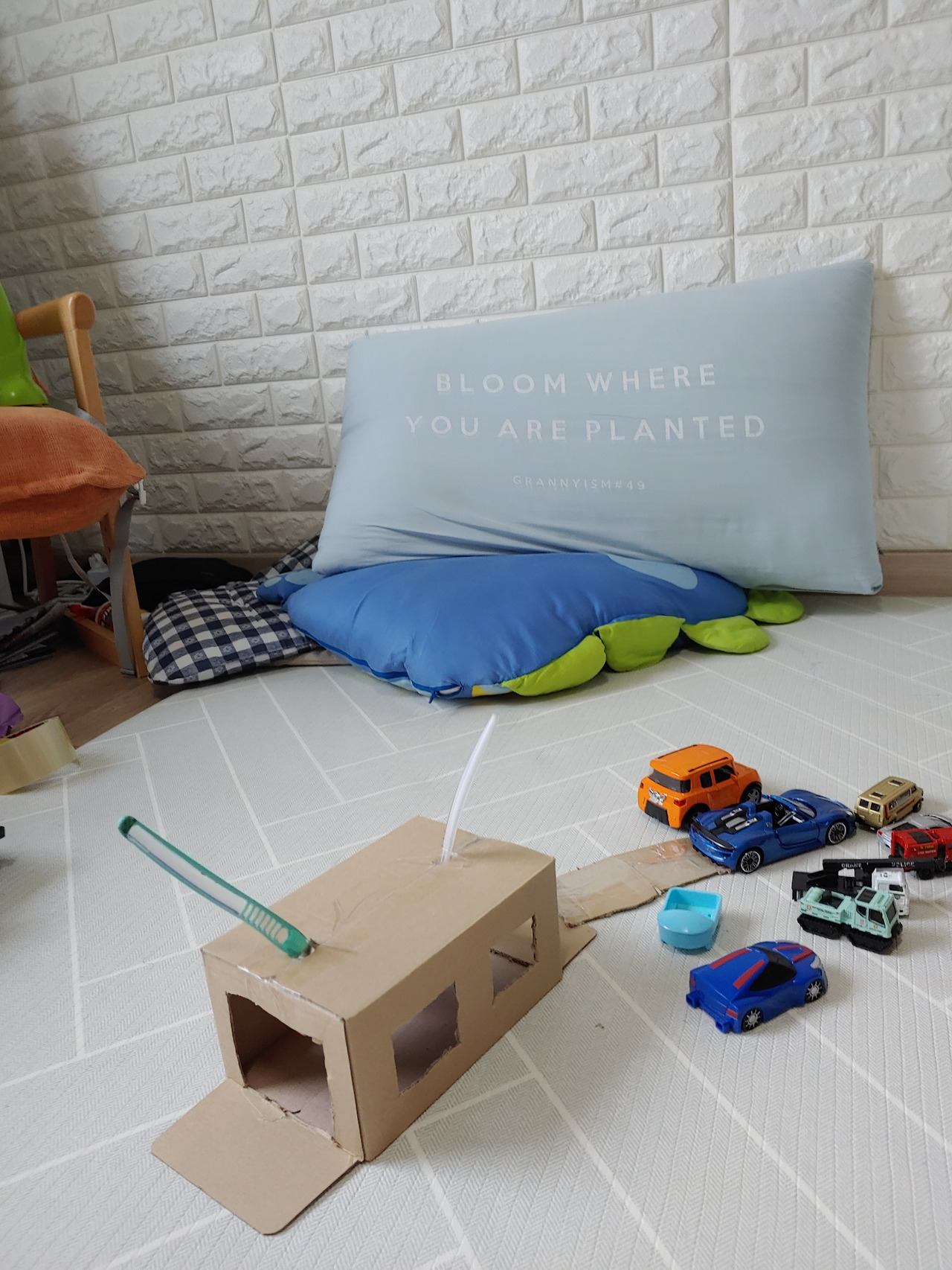 보다시피 책과는 조금 다른 결과물이 나왔다. 칫솔이 입구에만 있는 것이 아니라 출구에도 있다. 움직이는 벨트도 별도로 만들었다. 더 흥미로운 건 책 매뉴얼엔 없는 선풍기도 등장한다는 점이다. 거기다가 직접 아이가 마지막에 손으로 직접 차를 닦는 과정까지 집어넣었다.