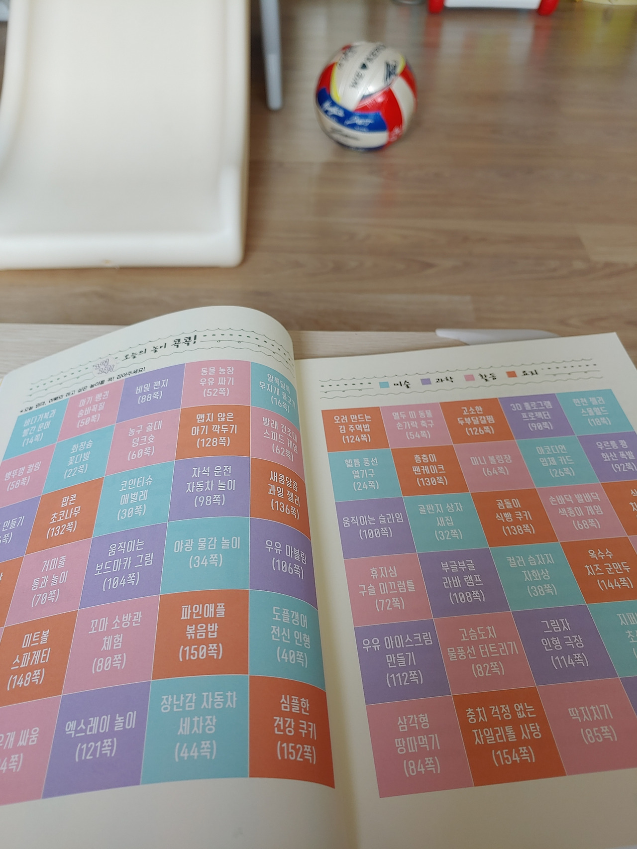 병뚜껑 컬링(활동), 우유 아이스크림 만들기(과학), 아코디언 입체카드(미술), 옥수수 치즈 군만두(요리) 등 아이가 하고 싶은 '오늘의 놀이'를 선택할 수 있도록 '콕콕판'이 제시되어 있다. 전체를 네 가지로 나누었지만 사실상 모든 주제가 오감을 이용하여 노는 활동이다.