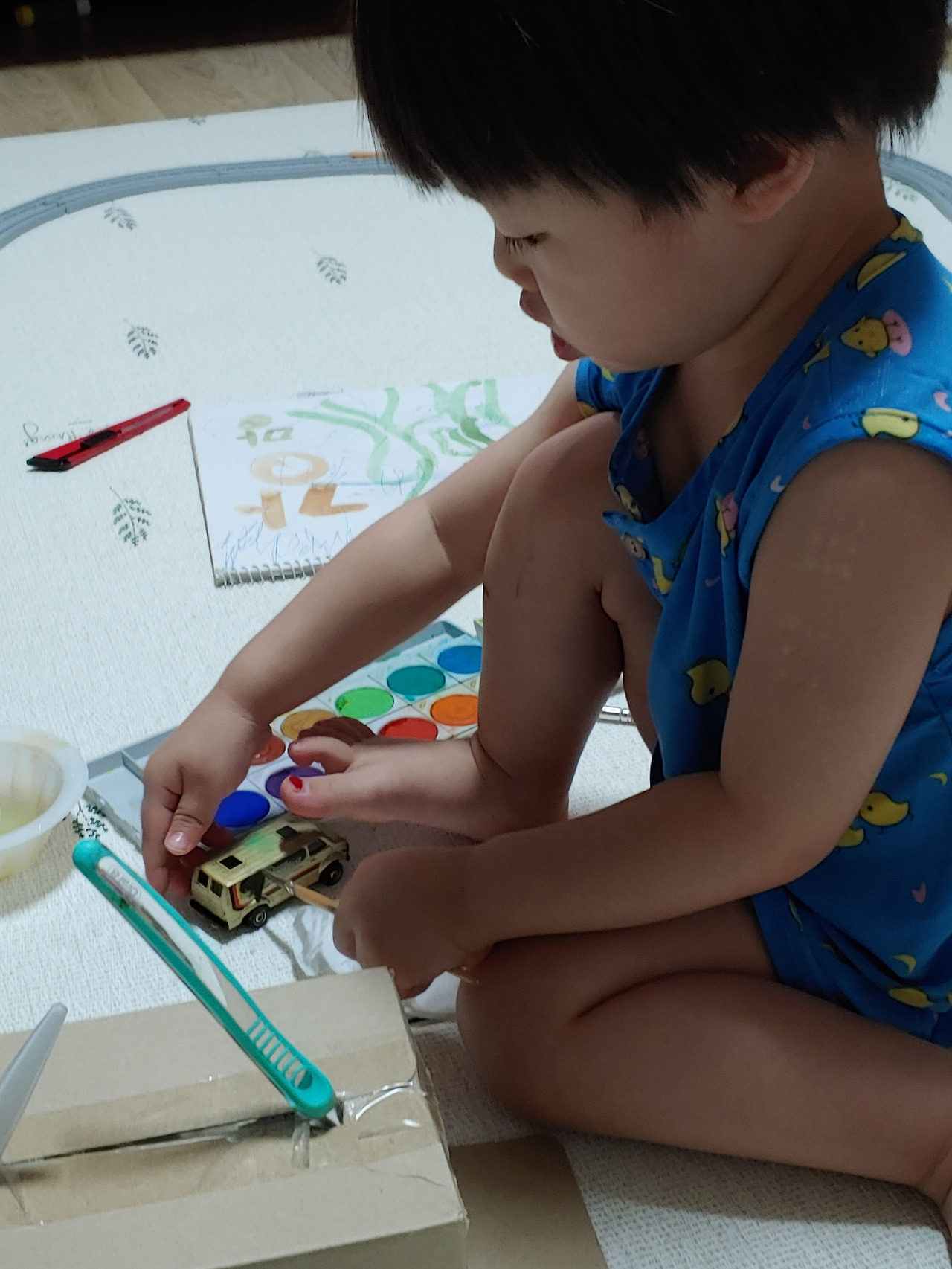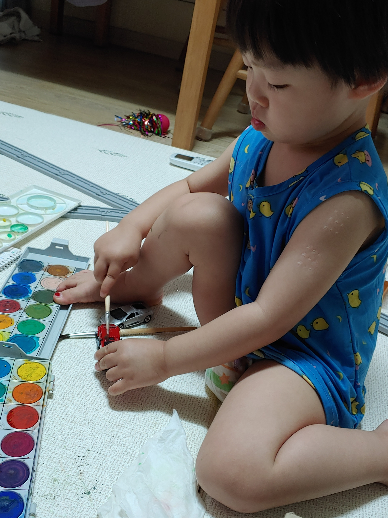 아이는 상상력을 더해 카센터까지 결합시켰다. 물감을 이용하여 차에 색칠을 한다. 기존의 차에 새로운 색을 입히는데 몰입감이 상당하다. 아이는 결코 책에서 시키는 대로만 하지 않는다.