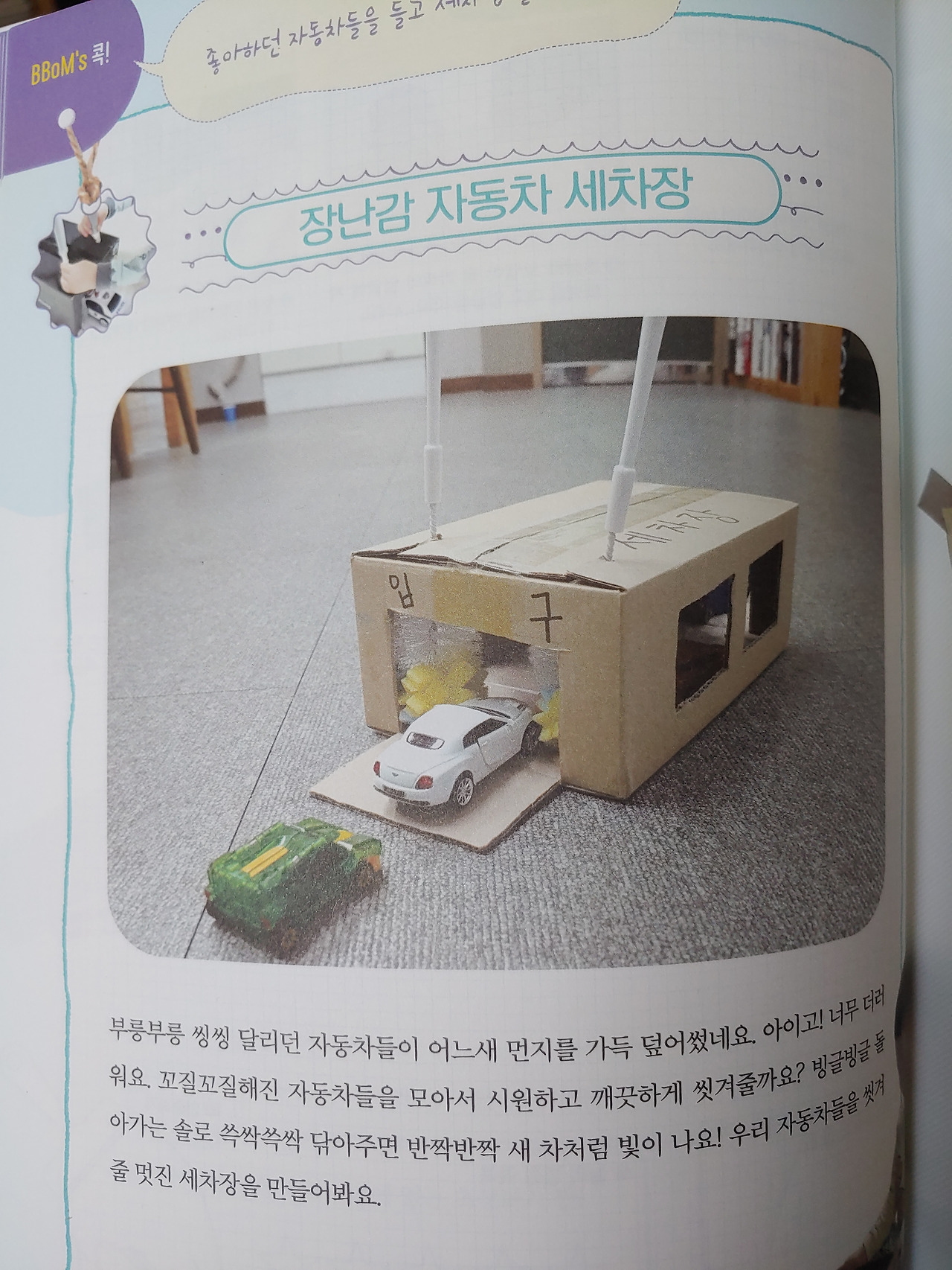 준비물은 간단하다. 골판지, 세척 솔, 장난감, 테이프, 칼 정도만 있으면 된다. 세차장을 만들어 차가 지나가면서 자동적으로 청소되는 시스템을 만드는 것이다.