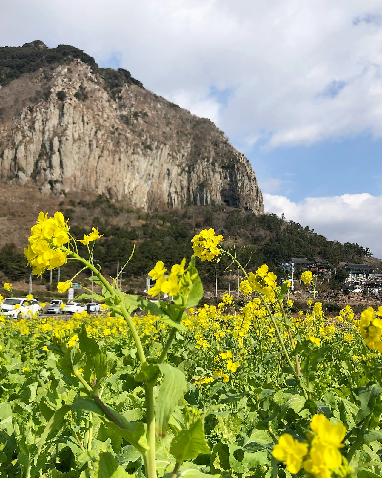 엄마를 산방산 아랫마을에 사시는 이모 댁에 모셔다드리는 길이었다. 산방산을 돌아 깎는 해안 도로를 붕~ 타고 올랐다. 한눈에 내려다보이는 사계 마을이 촤라락 펼쳐졌고 바로 눈앞이 노오랬다. 어! 유채꽃이네! 노란 유채밭에 사람들이 옹옹옹 모여 사진을 찍는 모습이 마치 코로나 이전 시대를 보는 것만 같았다. 봄인가 싶게 노란 볕이 비치는 정오의 유채밭은 보는 것만으로 유채향이 났고 따뜻했다.