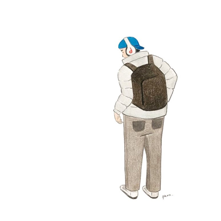 잘 닦인 검은색 가죽 백팩 사이로 깔끔한 아이보리색 패딩이 따뜻하겠다 생각이 들 때쯤, 베이지색 면바지 아래로 유난히 하얀 운동화가 눈에 띕니다.