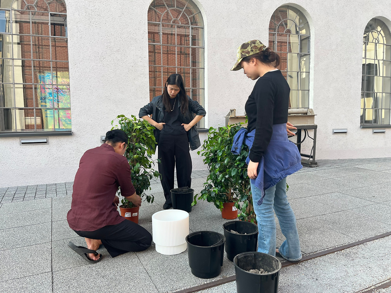 그때였다. “어, 이상한 소리가 어디선가 들리지 않아요? 어디서 경고음이 나는 것 같아요?” 민소연 씨가 두려운 표정으로 물었다. 렌탈 장비에서 문제가 생긴 것일까. 현지 장비 설치업체는 이미 철수한 후였기에 모두의 신경이 곤두섰다. 공간을 유심히 살피던 내가 대답했다. “그 경고음, 정은영 작가 작품 중간에 무대 객석이 이동하는 소리예요.” 안도의 웃음과 함께, 우리는 작품이 스스로 내는 소리에조차 얼마나 예민해져 있는지를 깨달았다. 모모세 작가의 모니터에도 비로소 생명이 깃들었고, 김정한 작가의 입체 안경도 제자리를 찾았다. 화분에는 흙이 채워지고, 우크라이나 국기색은 세 번의 덧칠 끝에 깊은 색감을 얻었다. 모든 것이 제자리를 찾아가고 있었다.