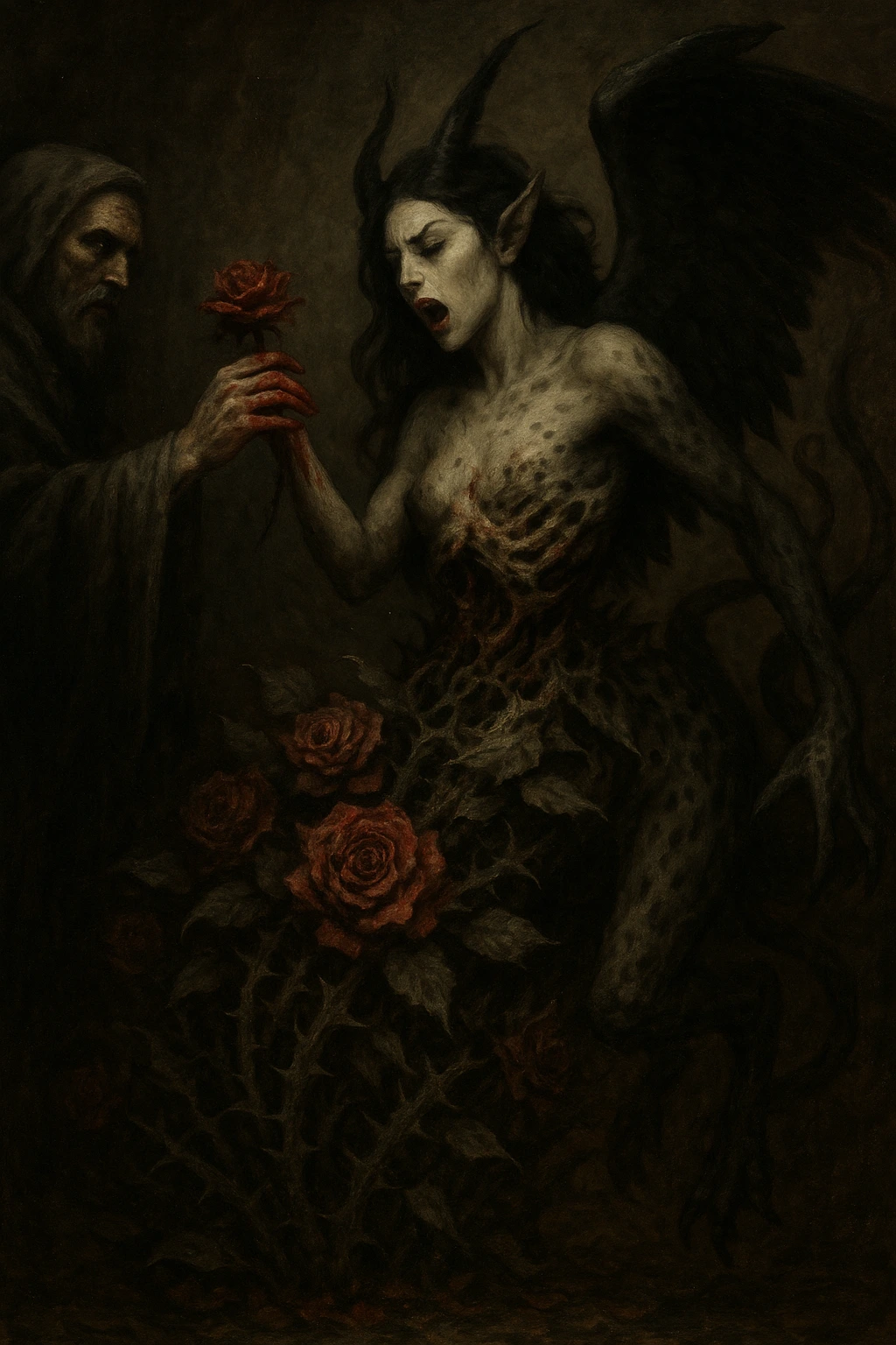"나는 욕망을 과시하고 타인을 유혹한 죄인이다. 이제는 화려한 장미가 아니라, 가시의 상처를 기억하며 절제하겠다."