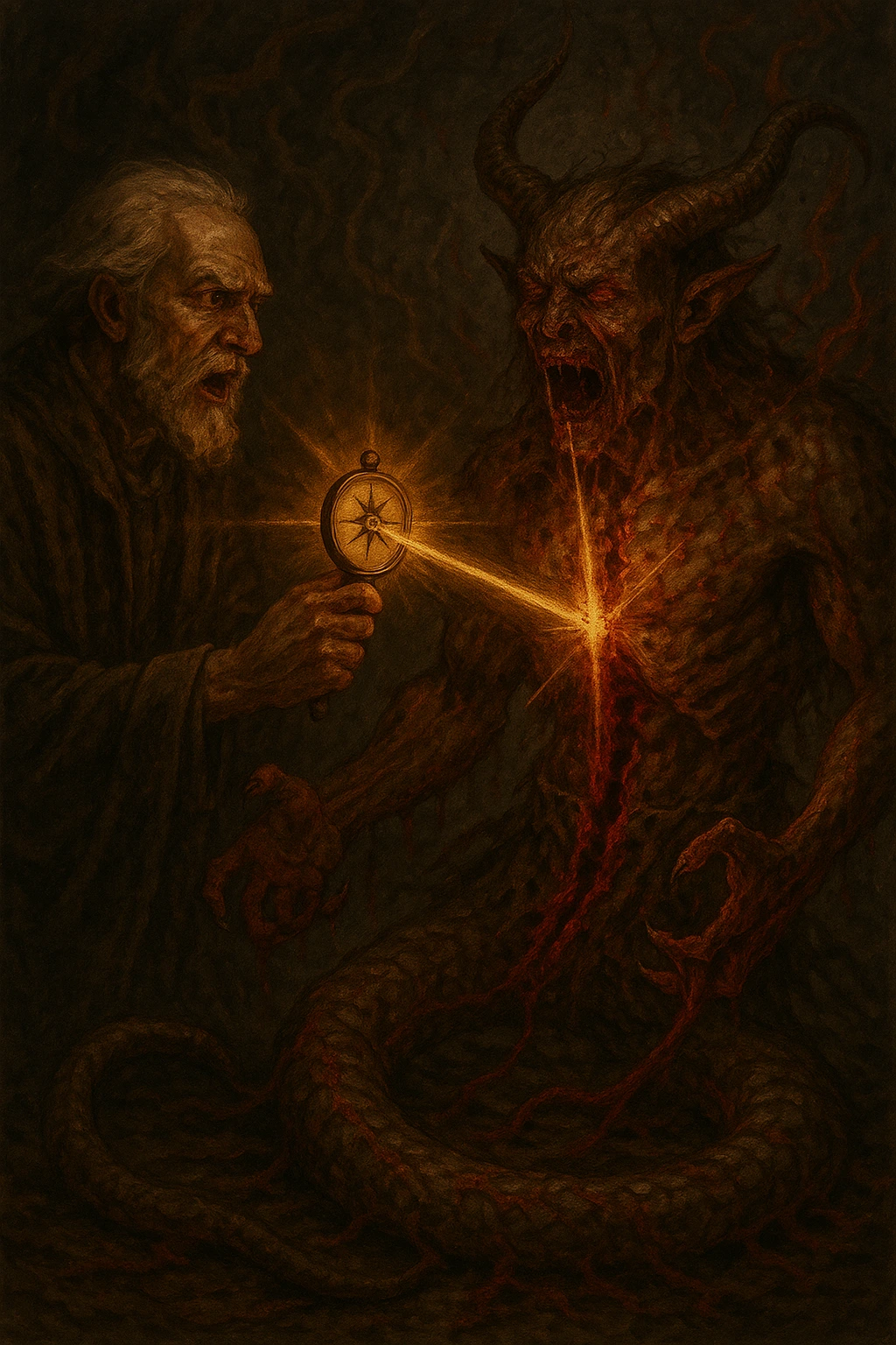 나침반의 빛이 바틴의 몸을 꿰뚫자, 그의 뱀 꼬리는 갈라지고, 끝없이 흔들리던 발걸음이 멈췄다.