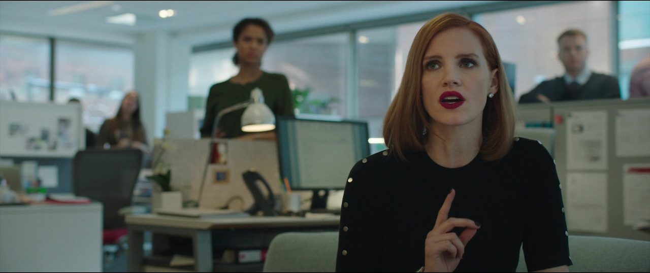 <미스 슬로운>의 많은 시간들은 내내 비슷한 공기를 머금은 사무실에, 호텔에, 서류를 살펴보는 공간에 할애되고 있다. 다만 안타깝게도 그 대부분의 시간들은 미스 슬로운에게 닥친 '텍스트적인' 위기 상황으로 채워지고 결국 '대사'로 해결되는 무수한 시간들로 남겨진다. 보다 더 심리적인 묘사를 공간에 부여했더라면 이러한 지루한 구성을 떨쳐버릴 수 있었을 텐데 라는 생각이 든다.