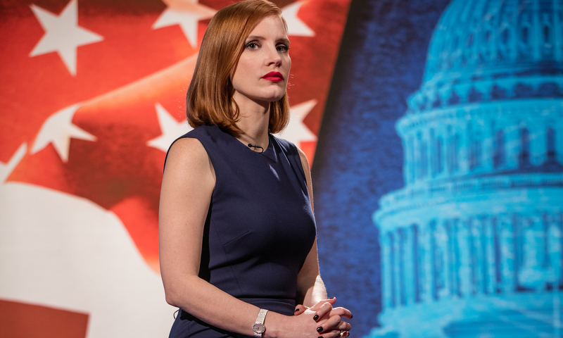 2) 이 영화는 로비스트의 이야기지만 법정 드라마로 도드라지는 장면도 많다. 제시카 차스테인의 멋진 연기는 법정에서의 신문 중 분노랄지, 고백이랄지하는 장면들에 적잖이 할애되어 있다. 사회 시스템과 관련한 이슈와 이를 둘러싼 각 진영의 알력 싸움은 대사를 통해 나열되면서 정치 스릴러다운 면모도 충분히 보여준다. 뿐만 아니라 완벽주의자에 가까운 미스 슬로운의 징후적인 결핍을 대조적으로 자주 보여주면서 심리 스릴러의 긴장감도 놓치지 않는다. 사실 <미스 슬로운>은 주인공의 심리적인 강박에서 시작해 그 강박이 일종의 계획된 '큰 그림'이었다는 사실을 이야기함으로써, 영화 내내 산적되어 있던 위기들을 간단히 해결하기도 한다.