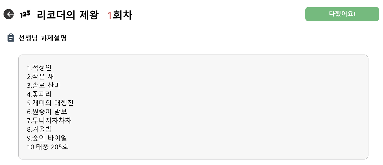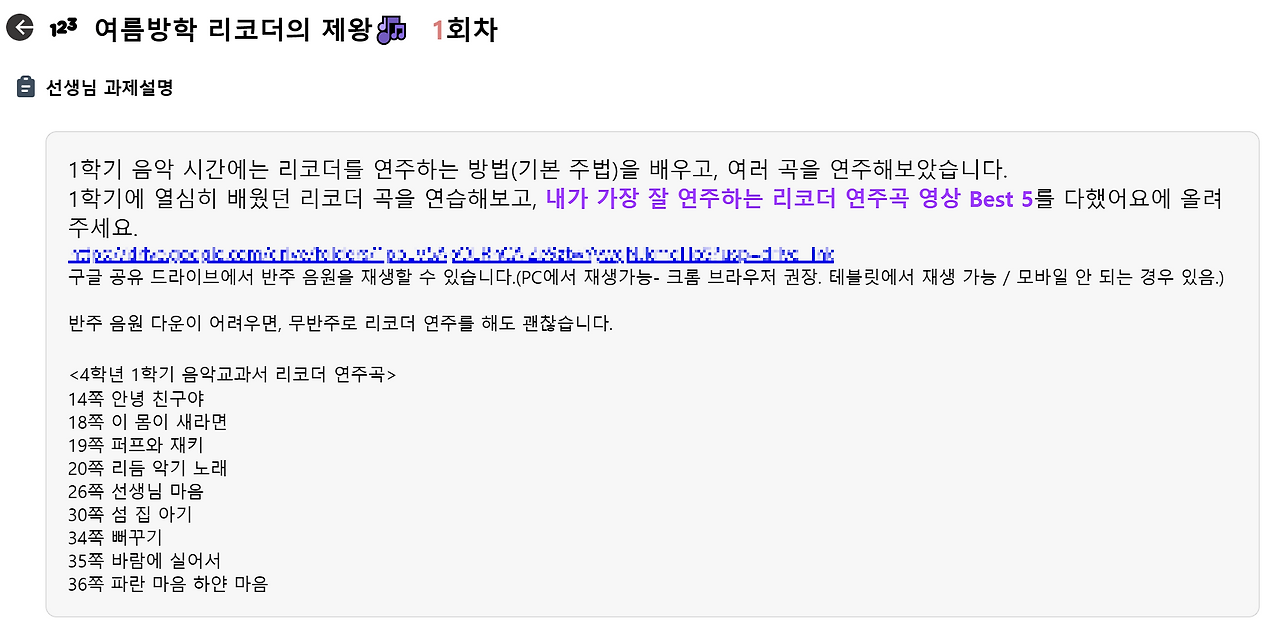 횟수형 반복과제는 특히 기능연습이 요구되는 활동 과제에 활용도가 높다. 나는 특히 리코더 지도에 관심이 많아서 리코더 기능 연습을 위한 용도로 학기중과 방학중에 리코더 반복과제 미션을 제시했다.
