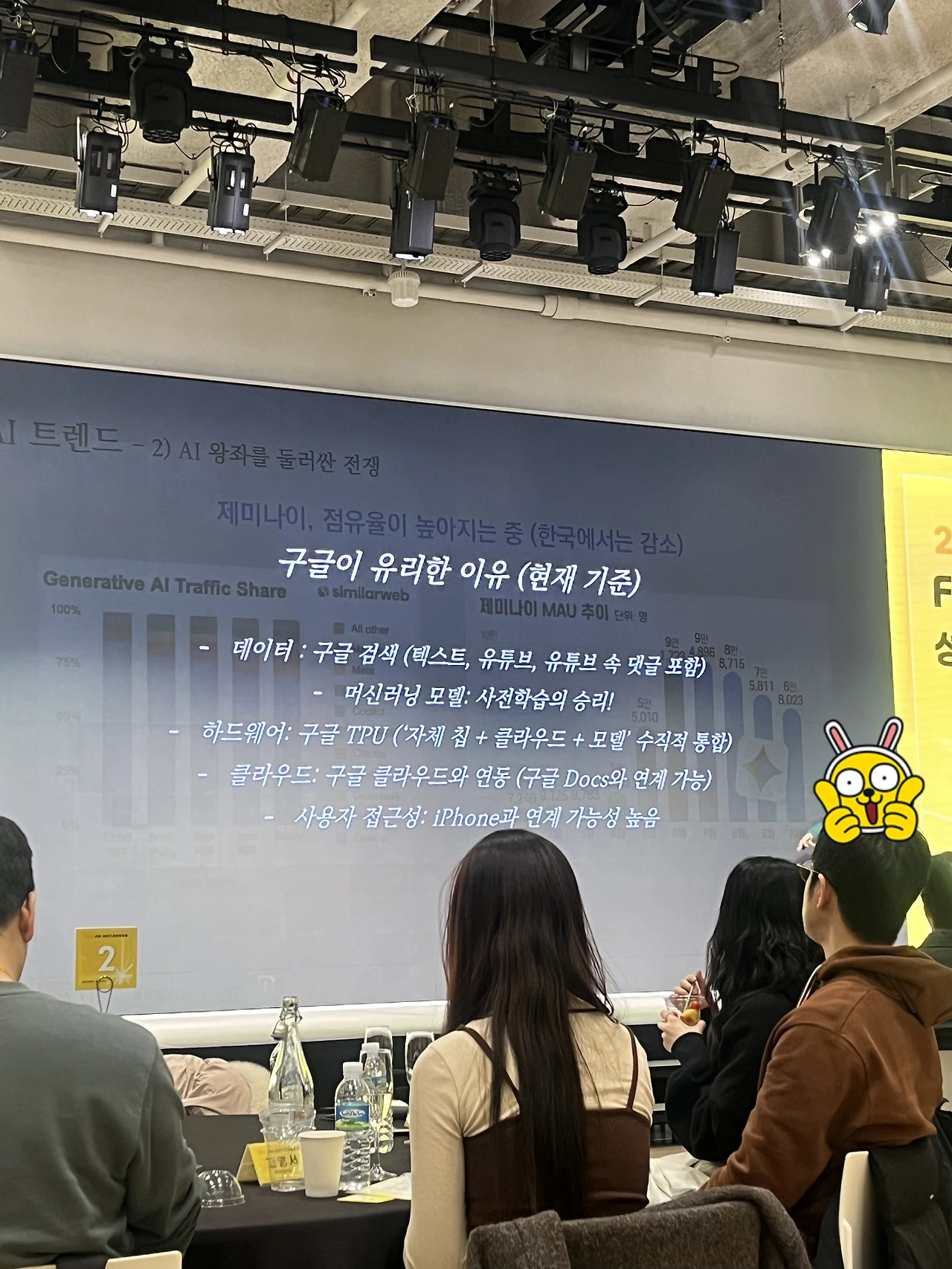 AI를 주제로 한 교수님 강연도 매우 인상적이었다. 교수님께서 예전에는 강의 요청을 받아 강연을 할 때는 비슷한 주제의 경우 이미 썼던 슬라이드를 재활용하고는 하셨는데, AI 주제의 강연은 그게 어렵다고 말씀하셨다. 일 년, 한 달 단위가 아니라 일주일만 지나도 AI 분야에서는 새로운 기술이 쏟아져 나오고 있기 때문이라고 이유를 설명하셔서 무척 납득이 갔다. 정말이지 눈 깜짝할 새 각양각색의 AI 모델들이 쏟아져 나오고 있어서 따라가기가 힘들 지경이다. 근래에는 제미나이에 대한 찬사가 여기저기서 많이 들려왔지만 나는 AI가 필요할 때면 오직 내 첫사랑 챗지피티만을 꿋꿋이 켰다. 그런데 나만 그런 게 아니라 많은 한국인들이 처음 정 붙인 챗지피티를 떠나지 못하고 여전히 챗지피티에 충성하고 있다는 사실을 수치화된 그래프로 교수님이 보여주셔서 너무 웃겼다. 더 웃긴 건 근래 나의 알파벳 C가 효자 노릇을 톡톡이 해서 울적한 마음 한편에 소소한 행복을 주었는데, 나는 구글 주가와 제미나이 대세론의 상관관계를 교수님 강연을 듣기 전까지는 1도 이해하질 못하고 있었다는 점이다. 뇌동매매자로서 그냥 구글은 '근본'이라서 잘 가고 있다고 생각했는데, 제미나이였다. 그 대세라는 제미나이 덕분이었어! 심지어 제미나이는 자체 칩이라니! (이것도 처음 알았다.) 이 강연을 들은 후부터는 챗지피티를 로그아웃하고 주주의 마음가짐과 책임감으로 제미나이를 쓰기 시작했다.