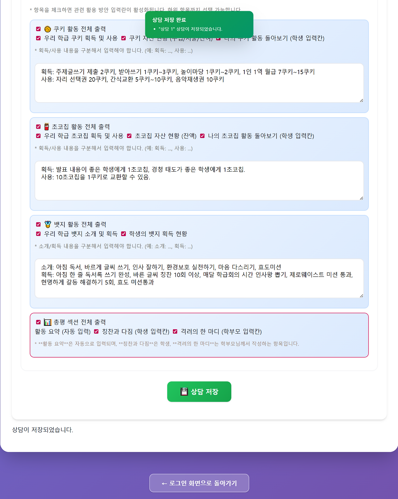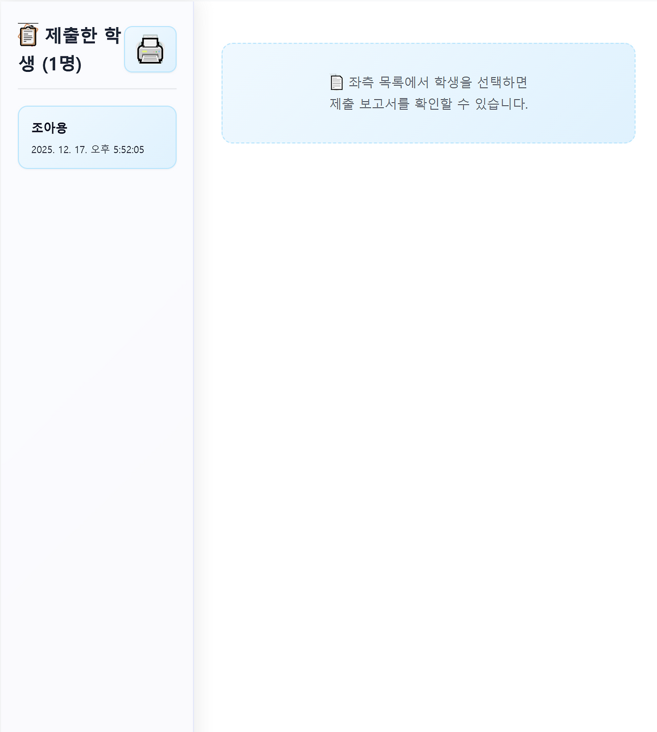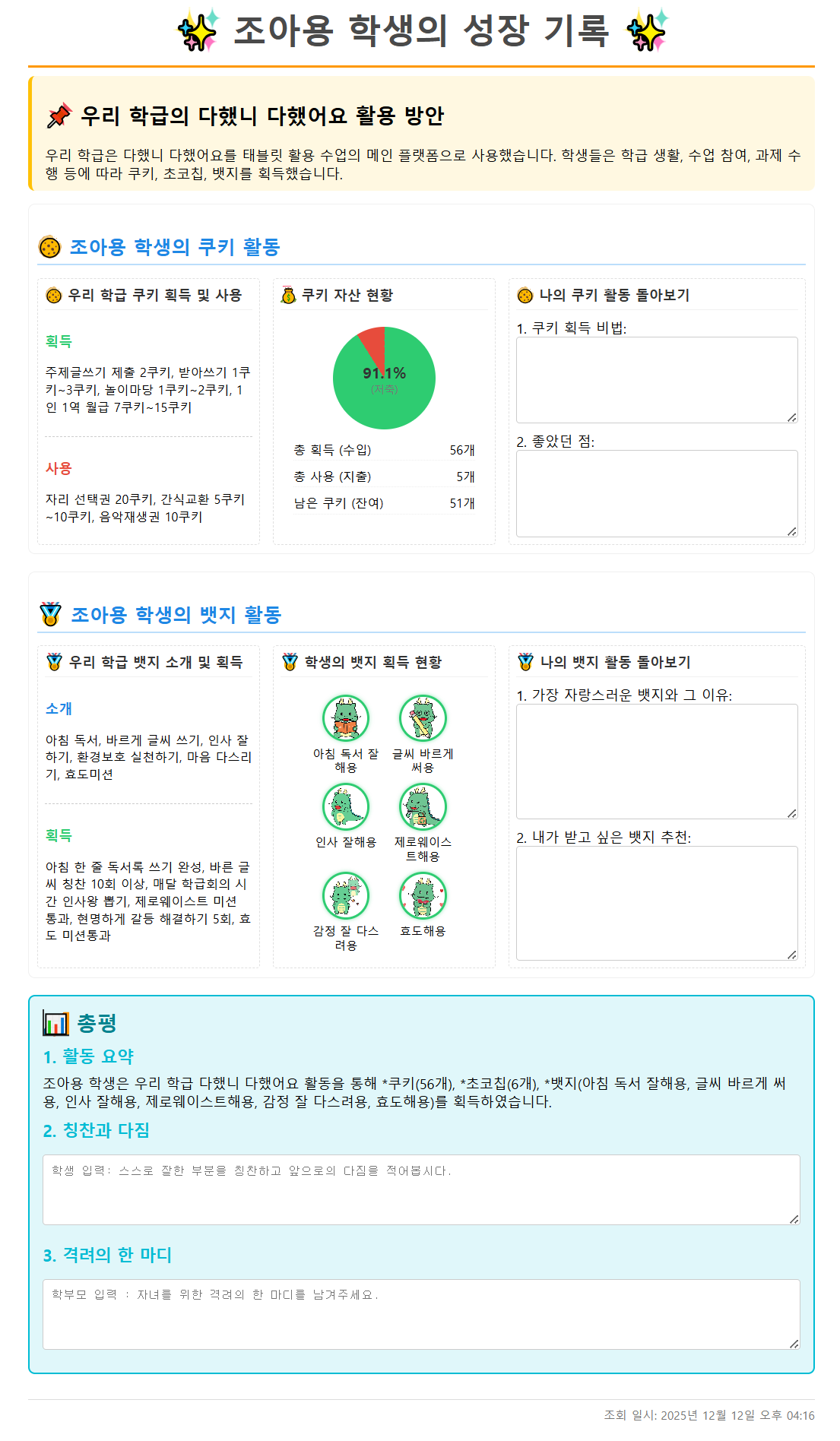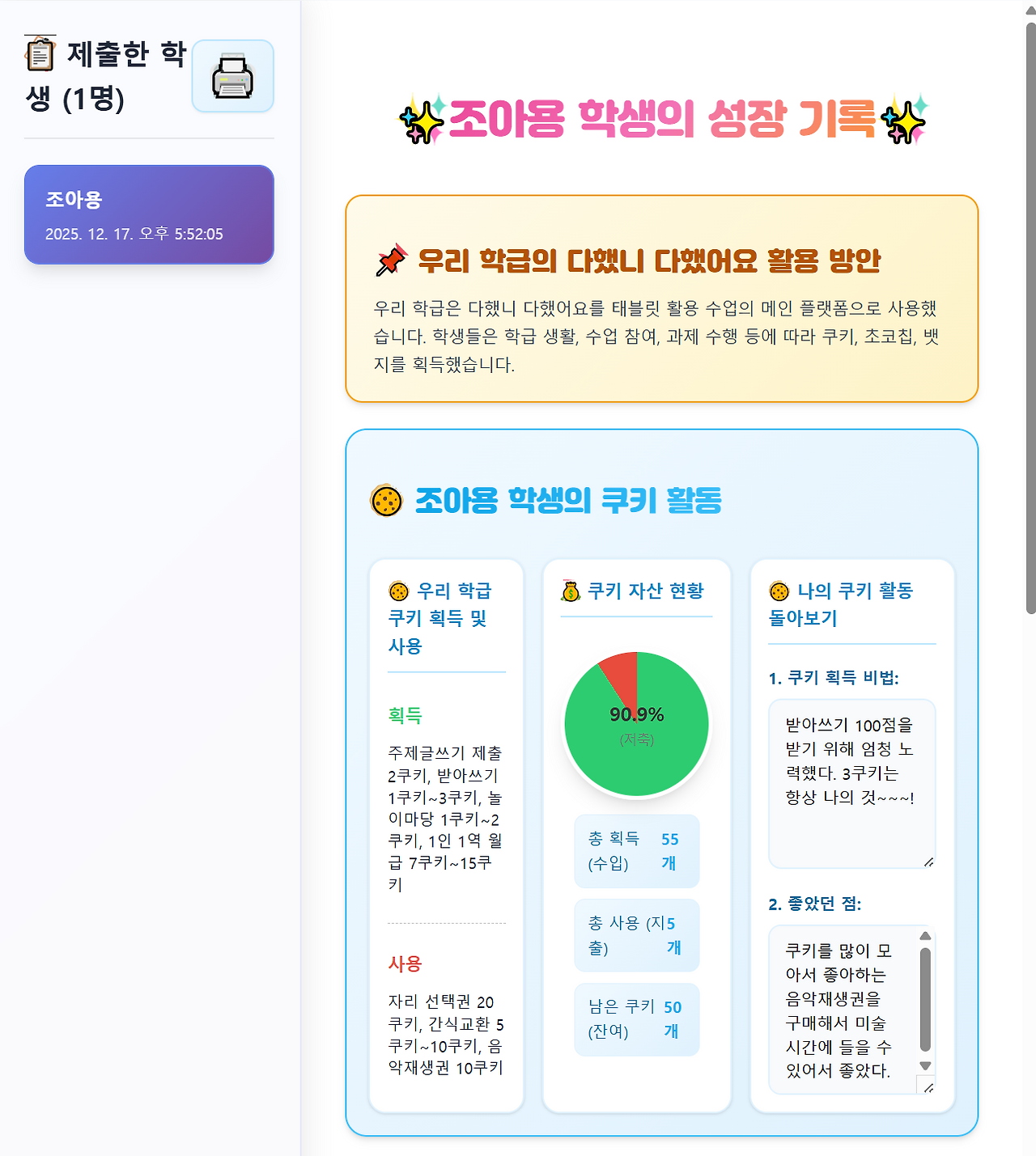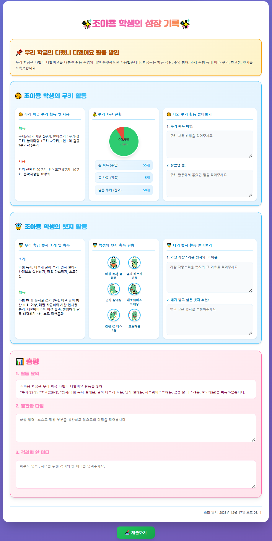 일단 ver1. 의 보고서가 너무 딱딱한 느낌이어서 디자인을 바꿔보고 싶었다. 모던, 큐티, 젠지 스타일로 변경부탁한다고 했더니 알아서 UI 리뉴얼을 척척해내는 클로드여! ver1의 성장 기록 보고서에도 학생 입력 칸은 있었지만 웹상에서 학생이 입력할 수 있는 기능을 완성하지 않았기에, 일종의 교사를 위한 데이터 요약본이었다. (종이 출력을 한다면 학생이 직접 쓸 수는 있었겠다.) 웹상에서 학생 입력이 가능한 양방향 플랫폼이 되기를 바라며 ver.2에는 "제출하기" 기능을 구현하였다.
