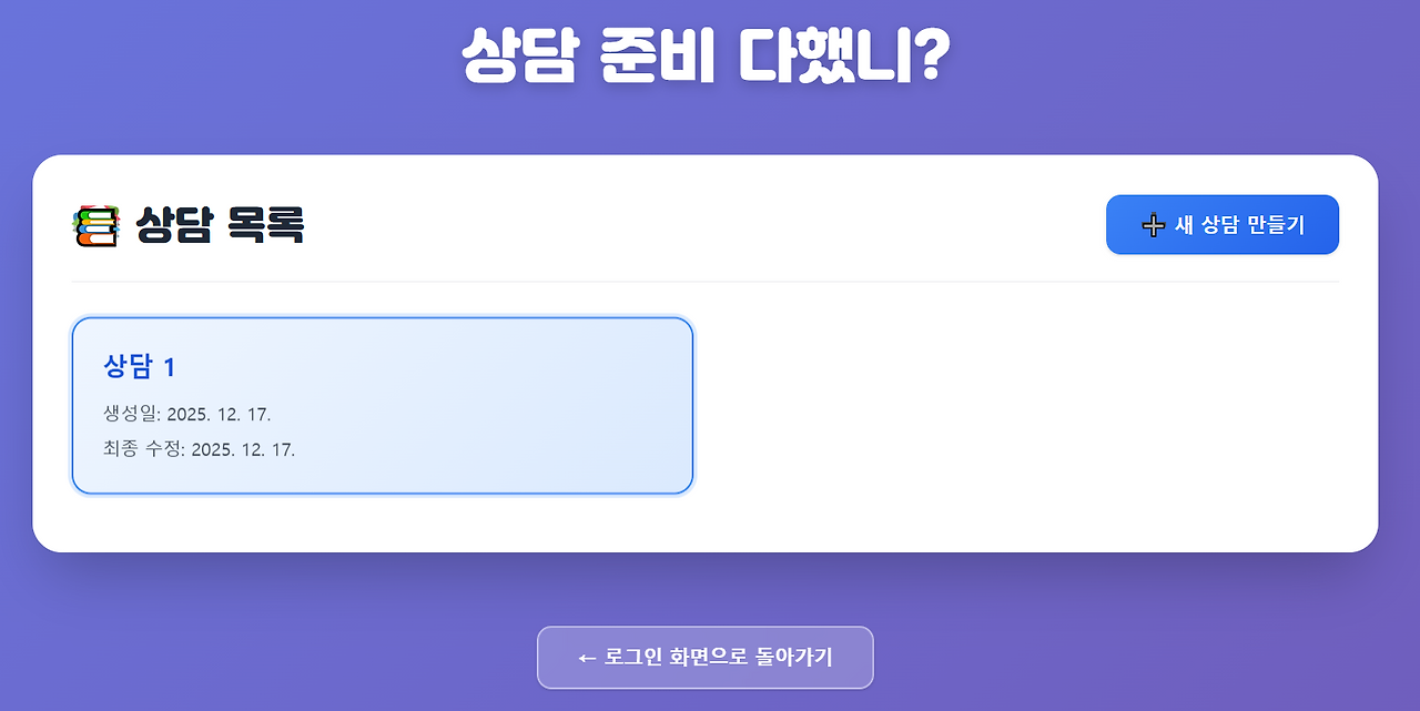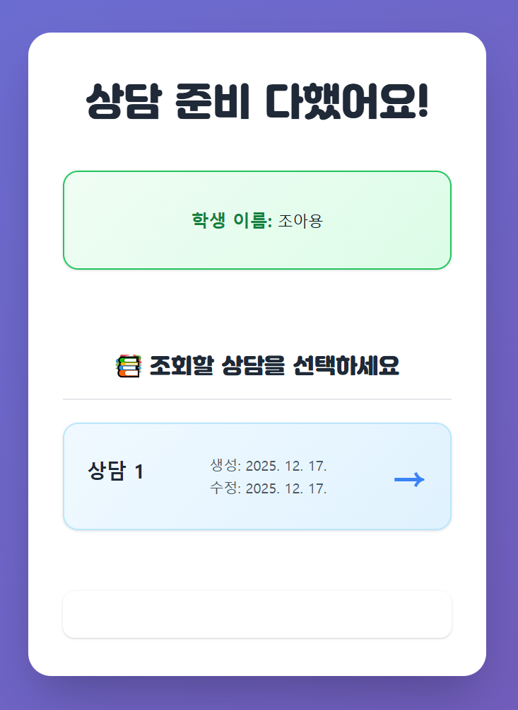 ver2. 에서는 생성된 상담들이 목록화되어 한눈에 관리되게 만들었다. '새 상담 만들기' 기능을 통해 상담을 회차별로 누적하고, 최종 수정일 등을 확인할 수 있는 아카이브 구조를 갖췄다. 그리고 학생이 리포트 하단의 제출하기 버튼을 누르면, 교사용 화면의 제출 학생 목록에 실시간으로 이름과 제출 시간이 업데이트되도록 했다.