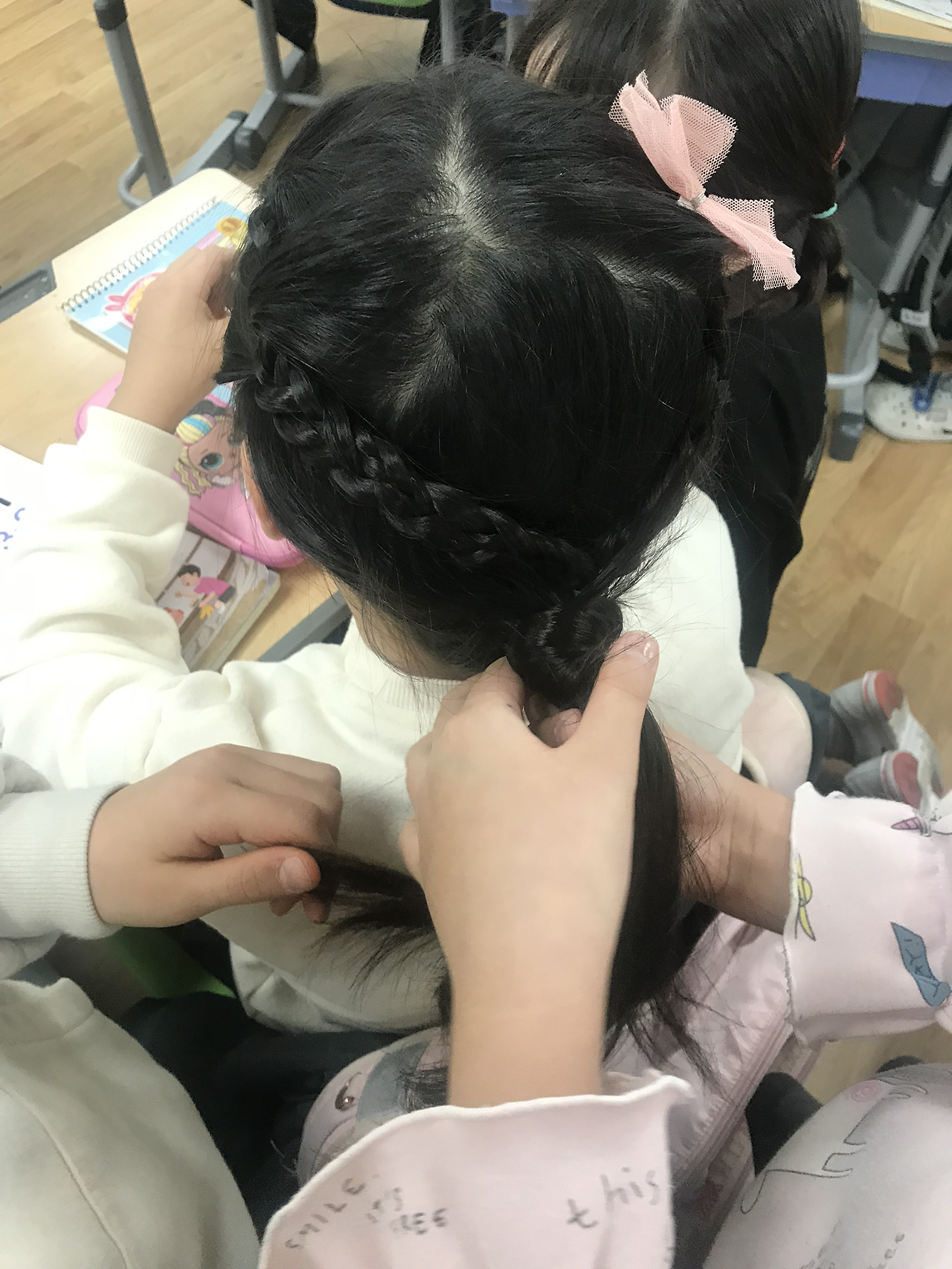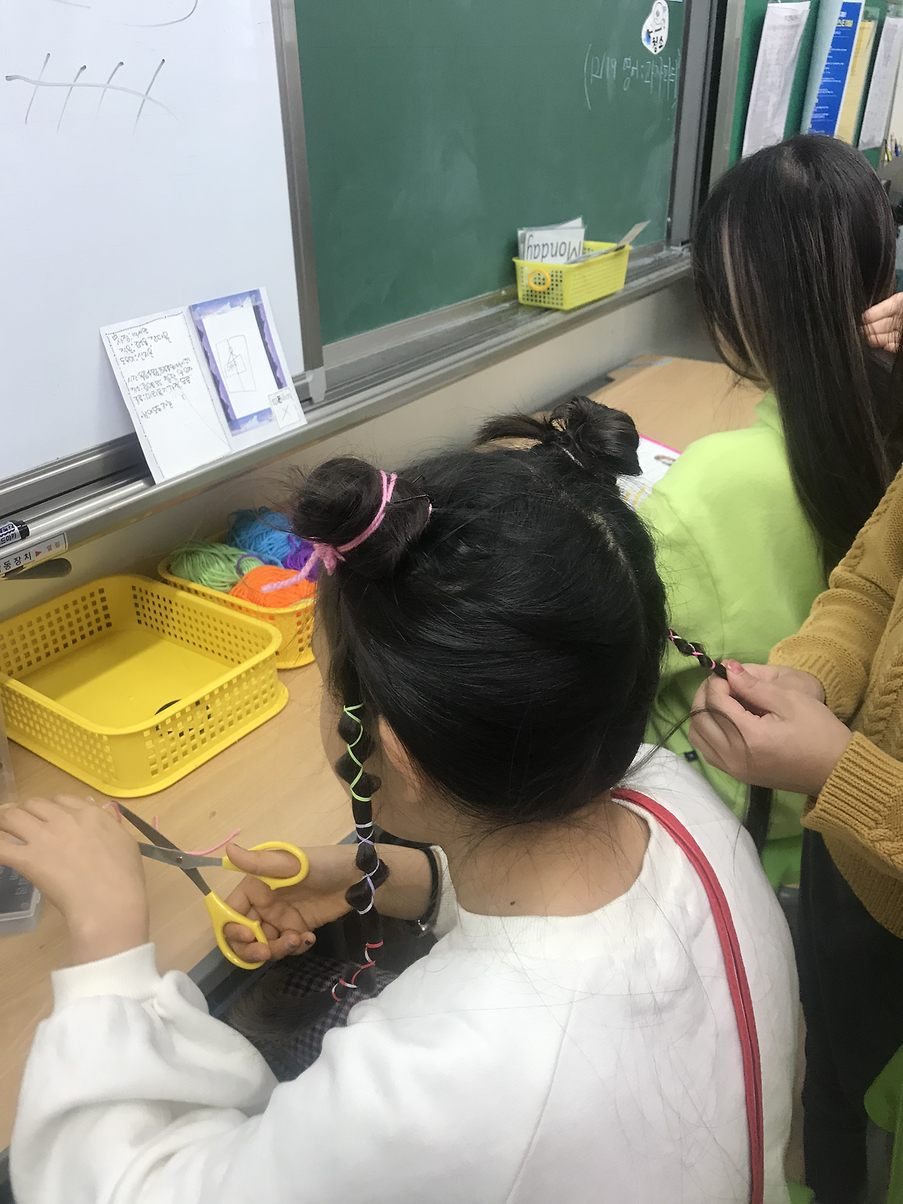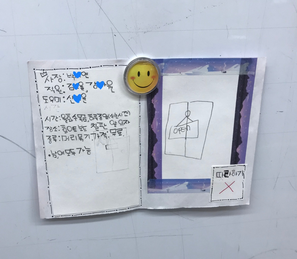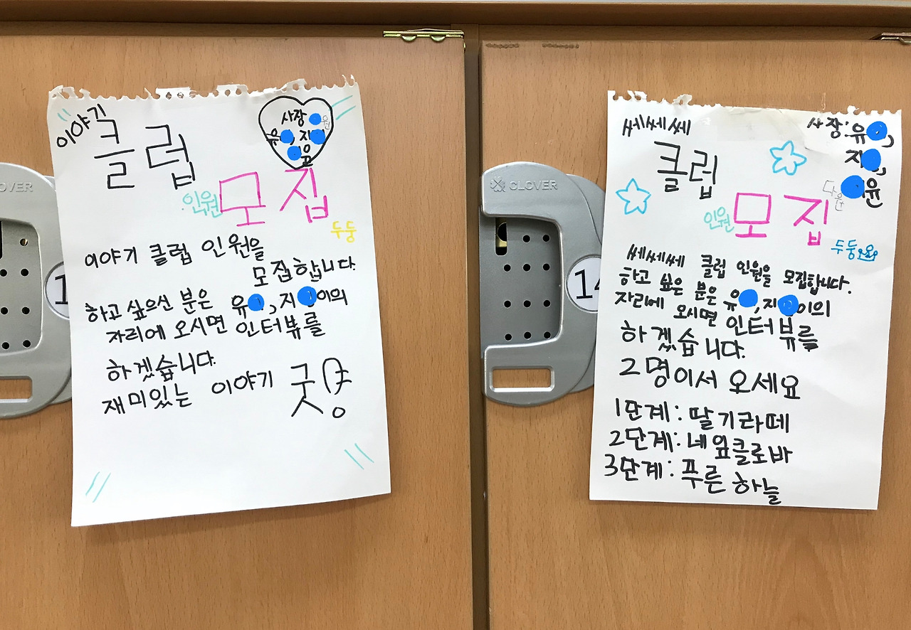 아이들 놀이 구경 중에서 특히 흥미로웠던 것은 여학생들의 ‘클럽 모집 놀이’였다. 그 놀이의 시작은 머리를 마구잡이로 풀어헤치고 윤지가 등교를 했던 어느 날이었다. 그날따라 윤지의 부모님께서 아침에 너무 바쁘셔서 어쩔 수가 없었다고 한다. 내가 묶어줘야겠다는 생각은 하고 있었는데, 1교시 마치고 쉬는 시간이 되자마자 같은 모둠에 앉은 연서가 윤지의 머리를 양 갈래로 땋아주었다. 연서의 머리 땋기 실력은 제법이었다. 이미 예쁘장하게 머리를 묶고 온 다른 아이도 별안간 자기 머리를 풀어헤치며 윤지처럼 머리를 땋아달라고 했다. 그것이 ‘머리 땋기 클럽’의 시작이었다. 나도 아이들에게 내 머리의 스타일링을 종종 맡겼다. 쉬는 시간에 ‘머리 땋기 클럽’이 선풍적인 인기를 끌자, 유사 클럽 모집 공고가 이어졌다. 그야말로 소모임 전성시대!