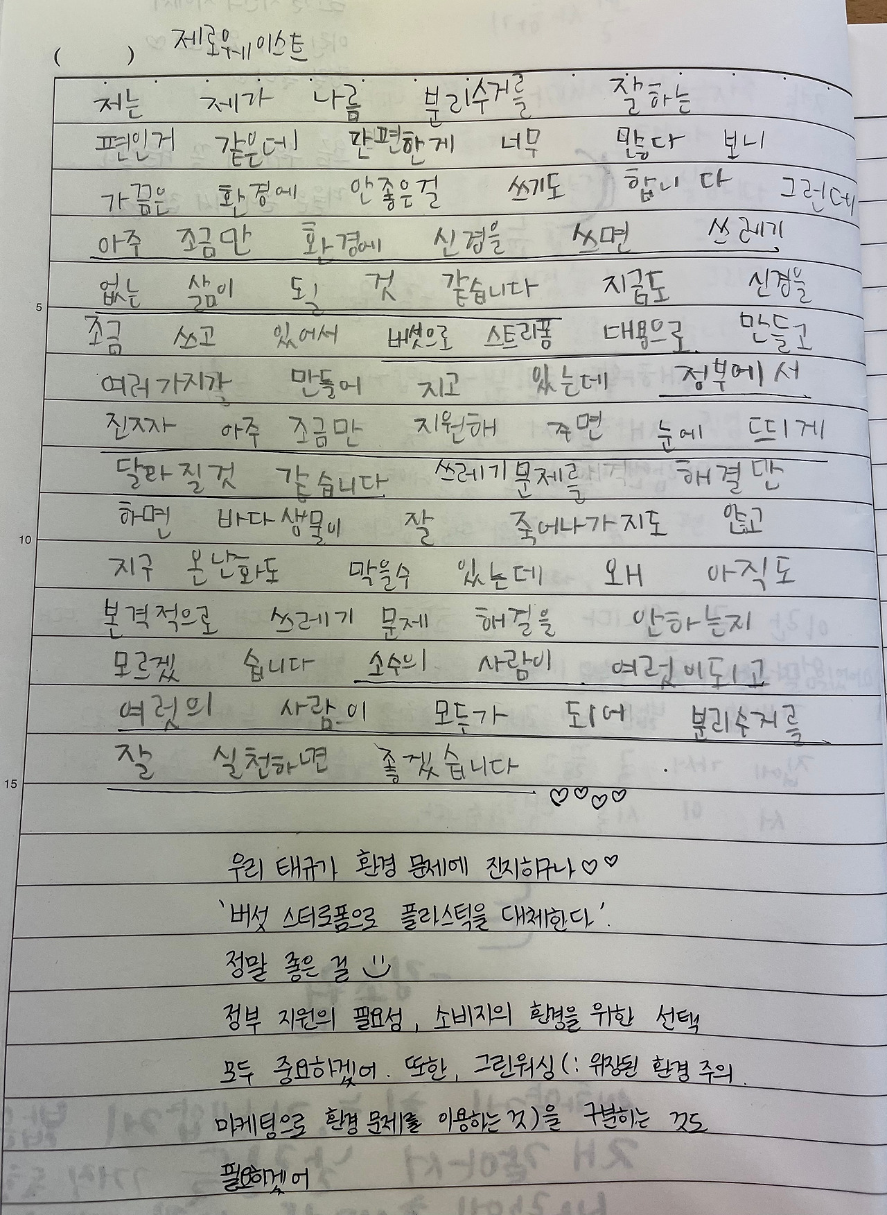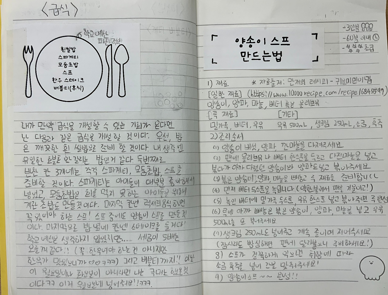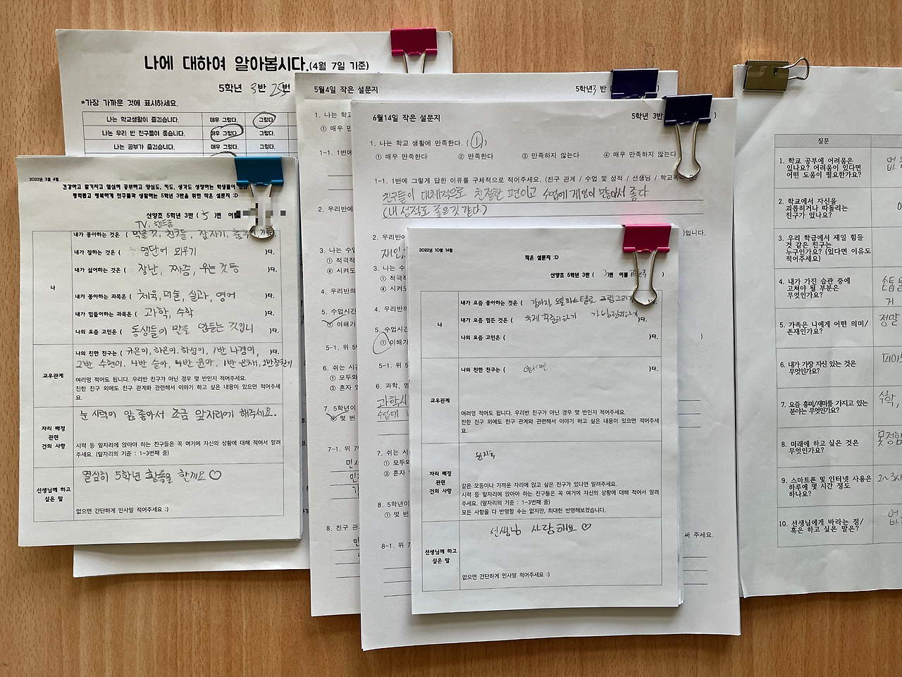 정말 많고, 참으로 다양한 아이들. 목소리가 우렁찬 아이, 갈등 상황이 다수 발생하여 상담을 자주 하는 아이, 여러 가지 이유로 눈을 뗄 수 없게 만드는 아이, 늘 곁에 머물며 말을 건네는 아이. 그리고 이런 아이들의 틈바구니 속에서 선생님과 아침인사 외에는 한 마디도 나누지 못하고 하교인사를 하고 교실을 떠나는 아이가 있다. 다인수 학급을 운영하면서 가장 마음이 쓰이는 부분이고, 주제 글쓰기와 작은 설문지를 시작하게 된 배경이기도 하다. 그렇다고 해서 주제글쓰기와 작은 설문지가 내향적인 학생들만을 위한 도구는 아니었다. 다인수 학급에서 개별적 소통의 부족함은 외향적인 학생들 또한 피해 갈 수 없다. 꼭 주제글쓰기와 작은 설문지가 아니더라도, 담임교사가 개별 학생과 일대일로 소통할 수 있는 창구를 마련해 두는 것은 학생과의 레포 형성 및 안정적인 학급 운영을 위해서 꼭 필요하다고 생각한다.
