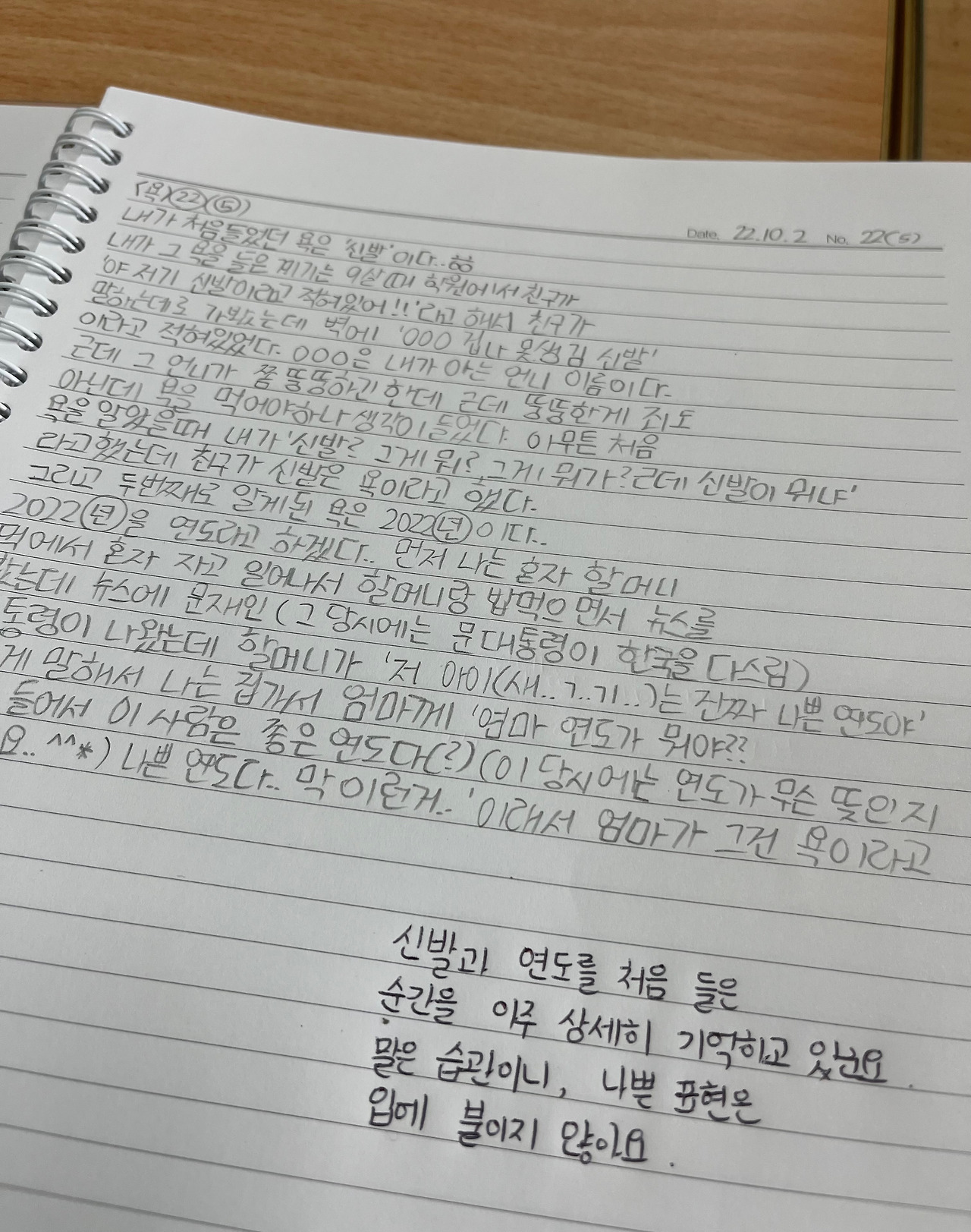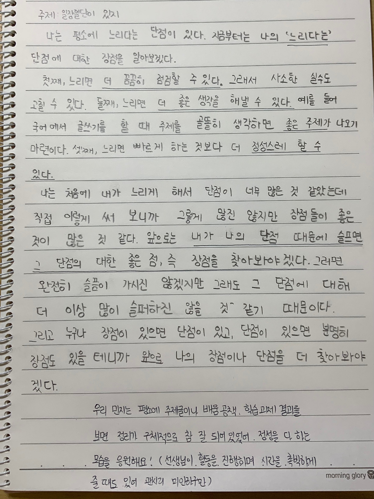 3학년 담임을 했을 때는, 일주일에 두 편의 글을 쓰도록 과제를 제시했다. 3~4월에는 7줄 이상, 5월 이후에는 10줄 이상을 쓸 수 있도록 안내했다. 실은 글쓰기에 분량을 제시하는 것을 좋아하지 않는다. 그래서 꼭 분량을 채우지는 않아도, 자기 생각이 진솔하게 담긴 글을 스스로의 힘으로 썼다면 분량에 대해서는 엄한 잣대를 두지는 않았다.