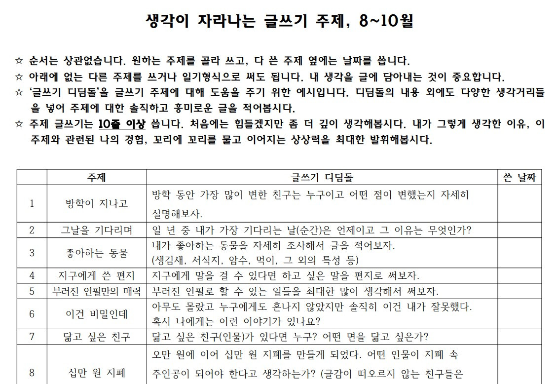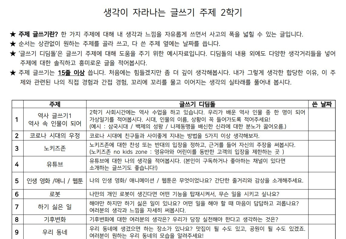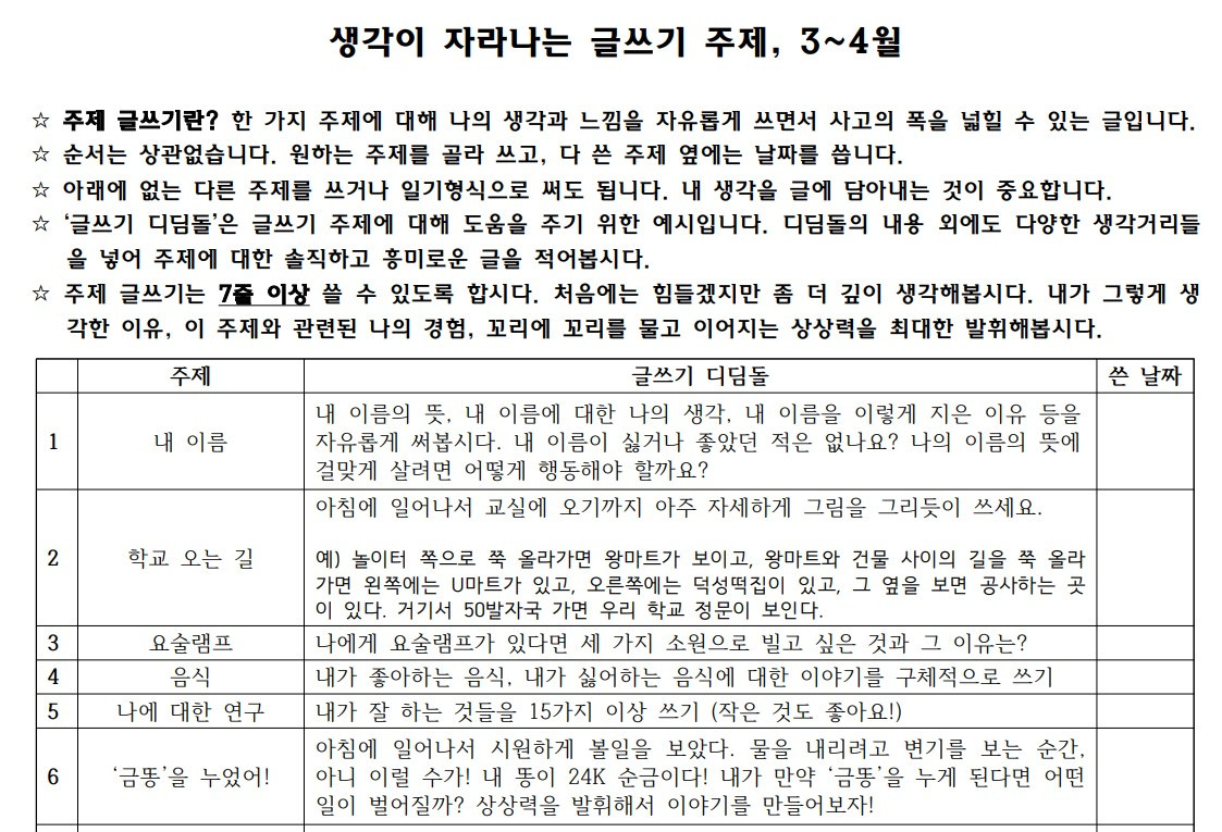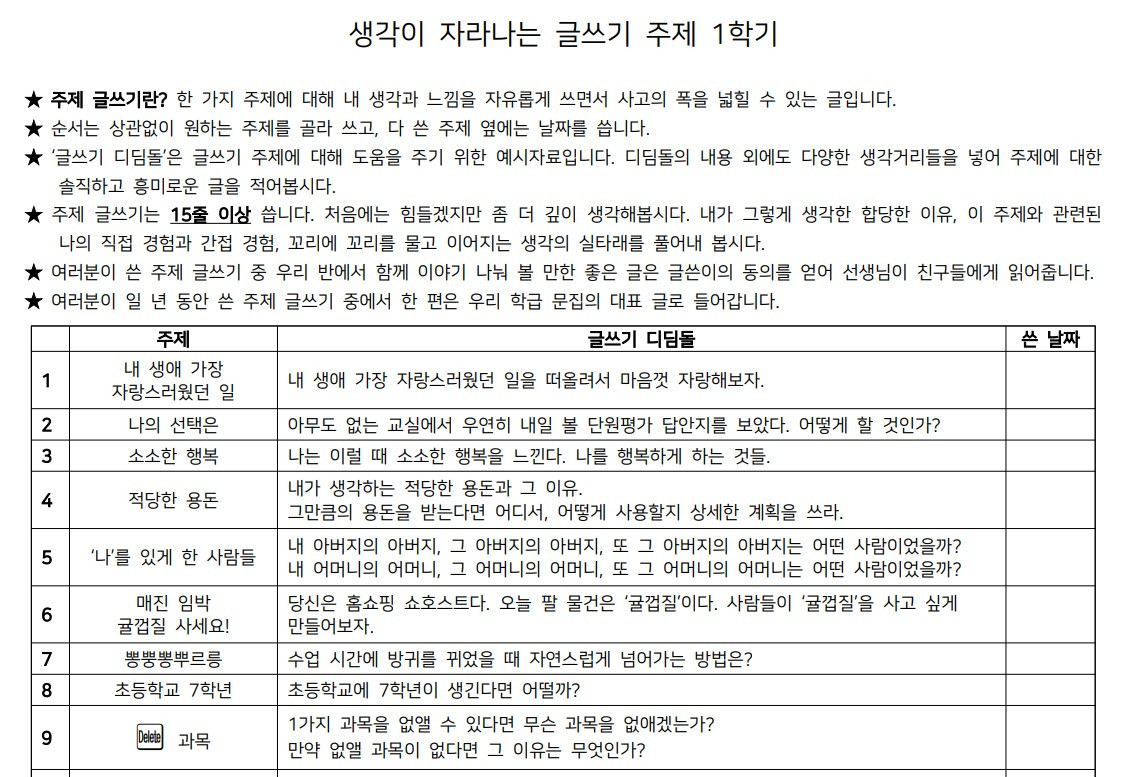 생각이 자라나는 글쓰기 주제는 '초등학생이 좋아하는 글쓰기 소재 365'를 참고하여 초안을 작성하고, '이오덕의 글쓰기', '월간 어린이와 문학', 그리고 인디스쿨에 여러 선생님들께서 공유해 주신 자료에서 도움을 얻었다. 하단에 공유하는 파일은 동일한 학년의 담임을 연임(3학년을 4년 동안, 5학년을 2년 동안)으로 맡은 후에 겪었던 시행착오를 통해 보완한 자료다.