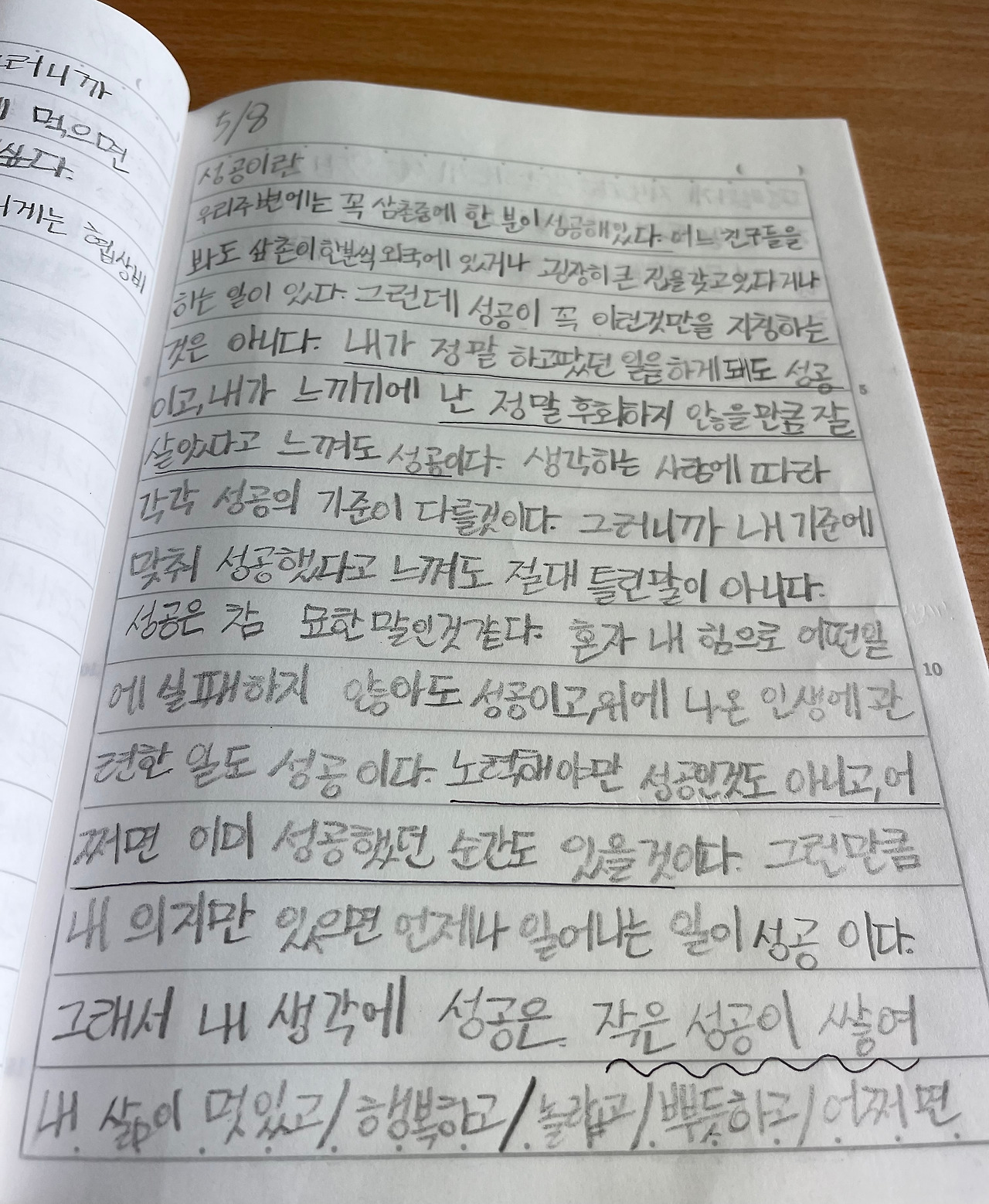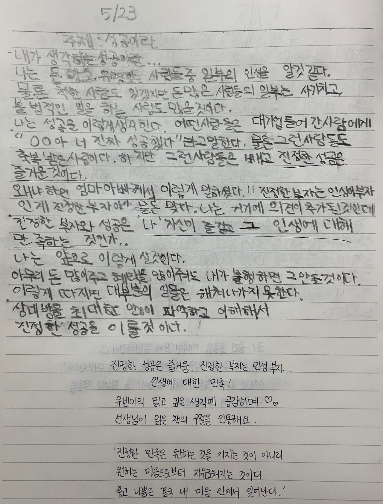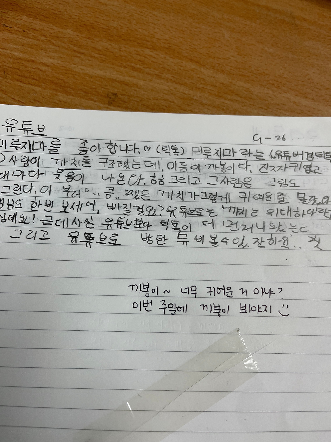 5학년 담임을 했을 때는, 일주일에 한 편의 글을 쓰도록 과제를 제시했다. 3학년 주제 글쓰기가 맞춤법 및 글씨 쓰기 지도에 대한 목적과 아이들과의 소통 목적이 반반이었다면, 5학년 주제 글쓰기는 아이와의 소통이 80%의 비중이어서 글쓰기 횟수에 큰 비중을 두지는 않았다.