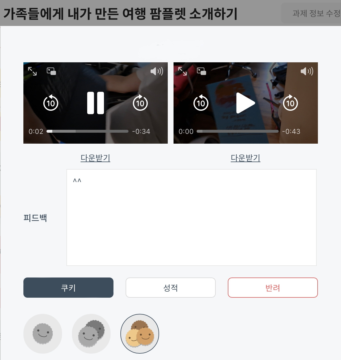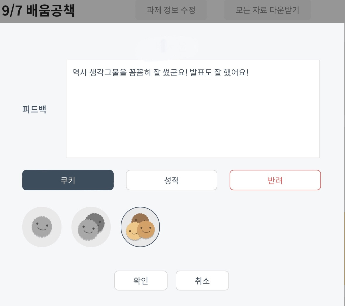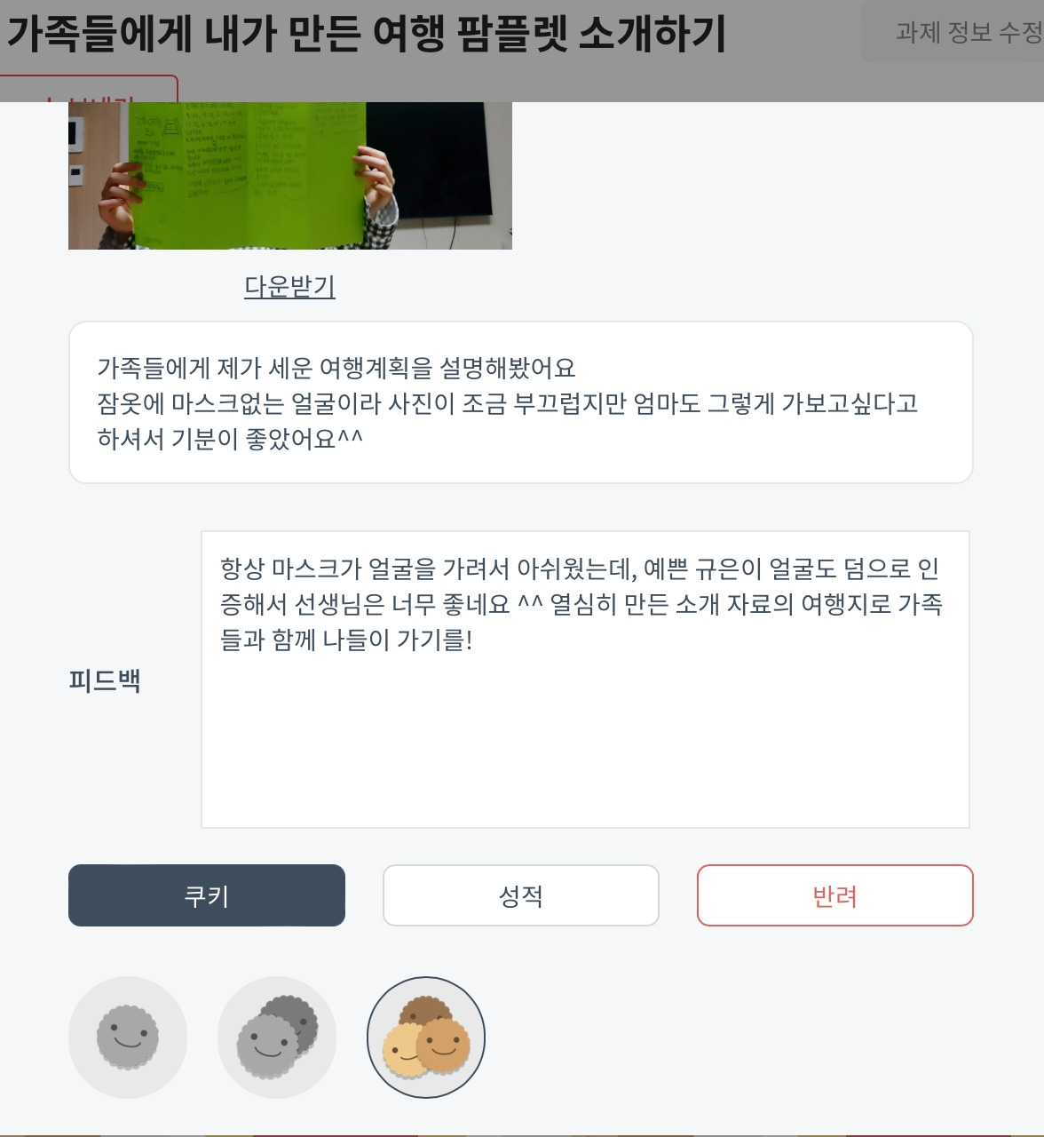 나의 경우, 학생들이 기록한 배움 공책을 보통 사나흘에 한 번 주기로 검사했다. 검사를 할 때, 1) 수업 시간에 필수 과제로 제시한 부분을 학생이 확실히 수행했는가 2) 학생이 학습하고 정리한 내용에 오류가 없는가를 중점으로 확인했다. 학생들의 공책에는 확인 도장을 찍어주고, '다했니'에는 <월/일 (검사일) 배움 공책> 과제 목록을 만들어서 학생이 수행한 정도에 따라 쿠키를 차등 지급했다. 학생들은 배움 공책에 찍힌 선생님의 확인도장과는 별개로, 본인 계정의 '다했어요' 어플에서 자신이 받은 쿠키 개수와 선생님의 피드백을 확인할 수 있다. 학생의 배움 공책에 바로 피드백을 적는 경우도 있지만, 학기말 성적 입력 시 누가기록의 자료로 활용하기 위해서 '다했니' 자체에 과제 피드백을 주로 작성했다. 키보드 타이핑이 주는 편리함도 중요한 이유였다.