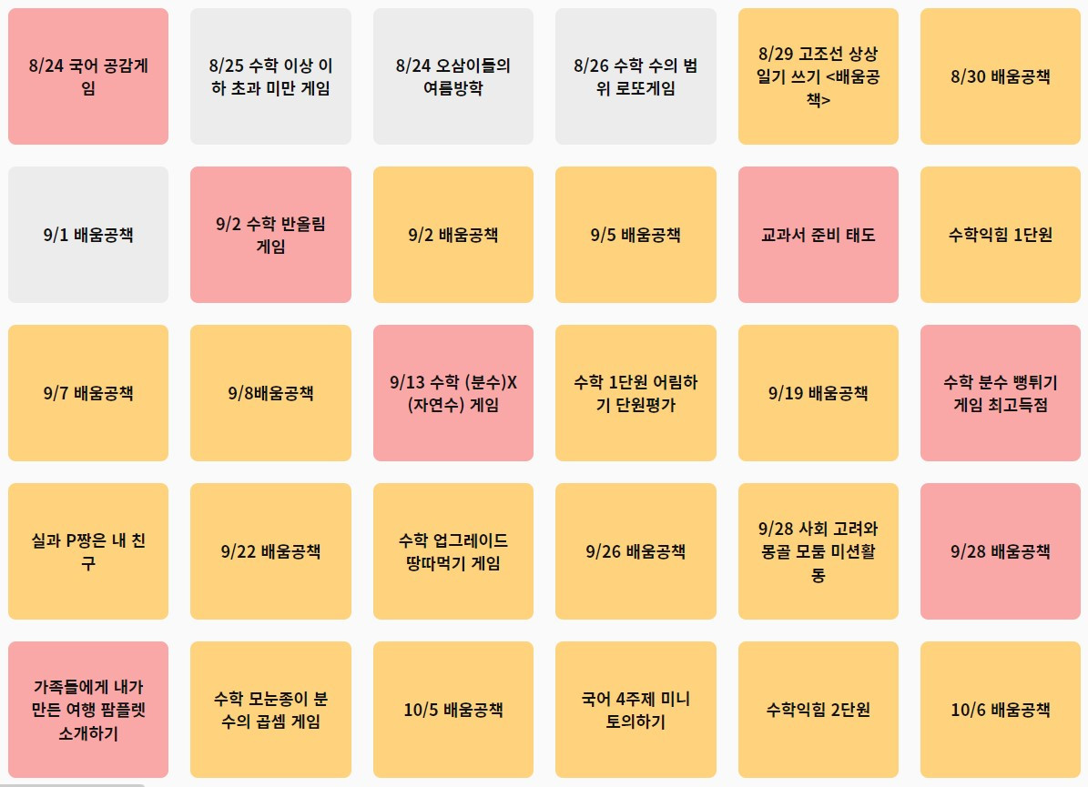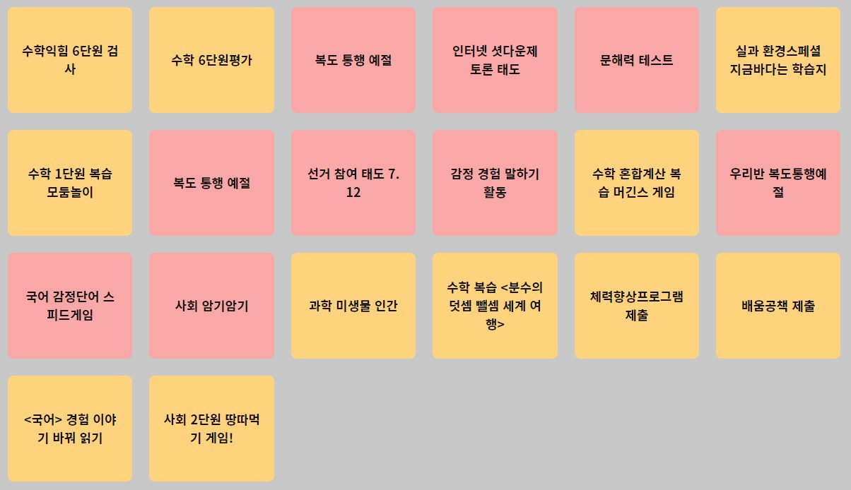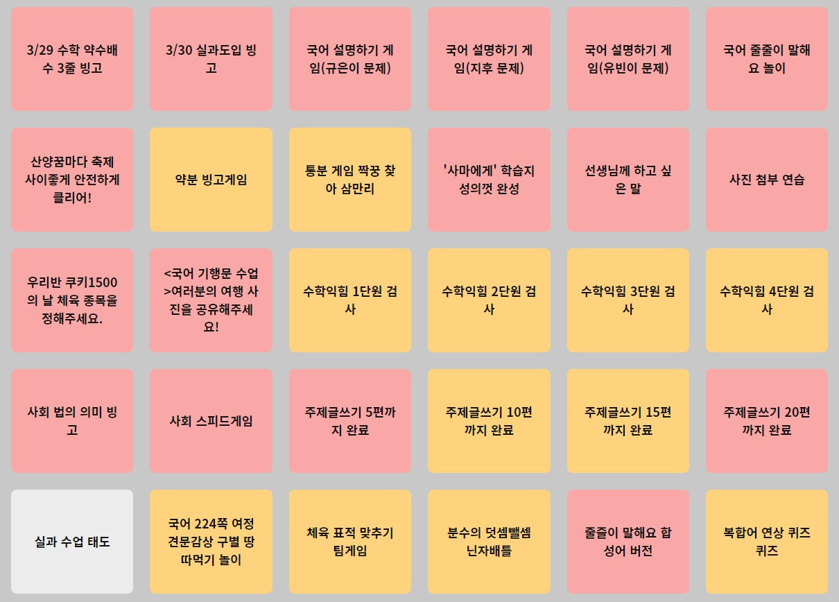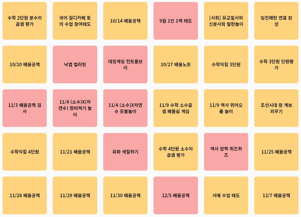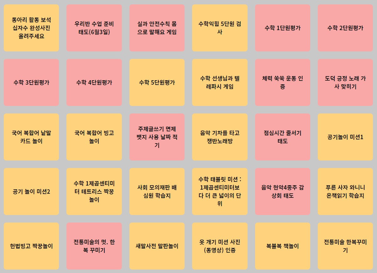 이번 글은 '다했니X다했어요'를 활용하여 개별 학생의 배움과 성장을 기록하는 과정에 대해 다룬다. 2022학년도에 '다했니X다했어요'를 통해 학생들에게 제시한 과제 목록을 아래와 같이 정리해 보았다.