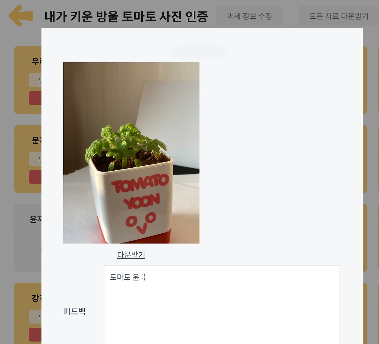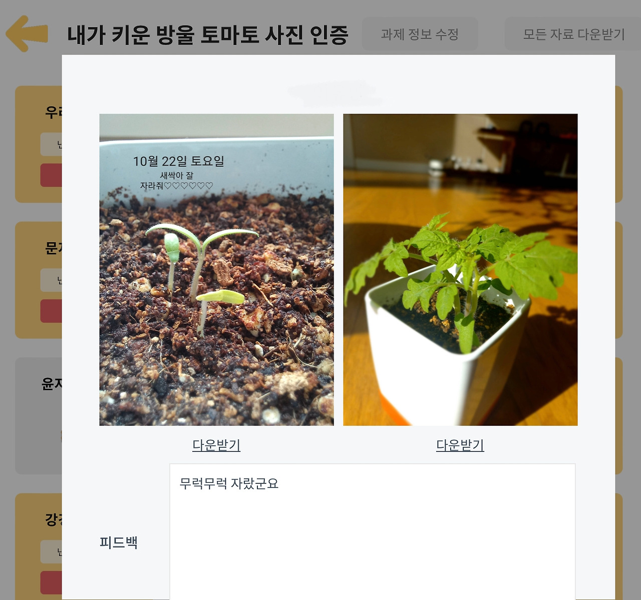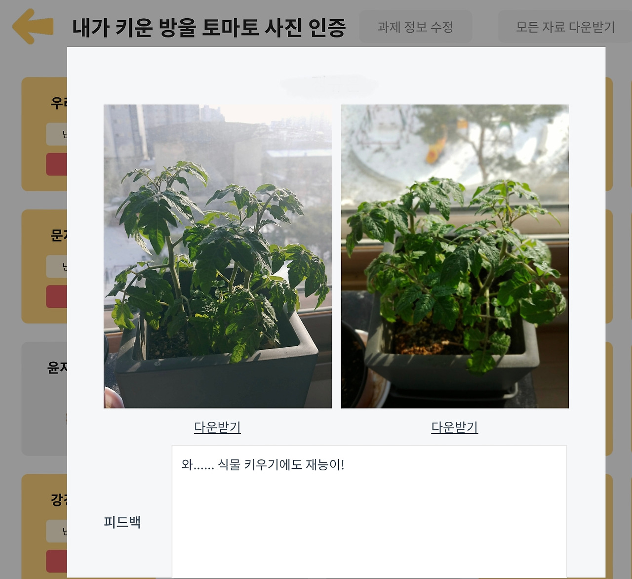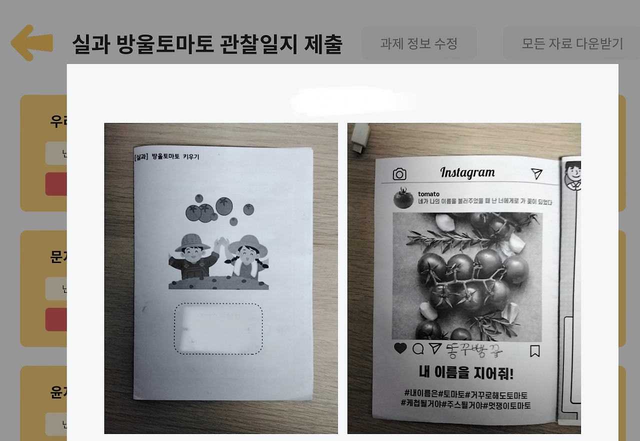 -실천 과제 / 가정에서 : 기르는 과정 사진 인증, 방울토마토 열매 단계까지 성공한 학생은 수확한 방울토마토 만든 요리 사진 인증
