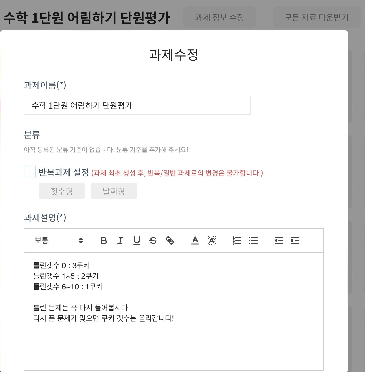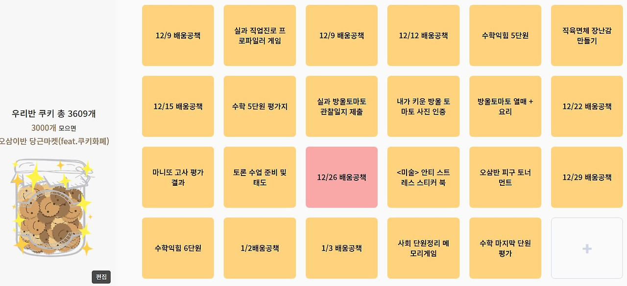 단원평가 결과 기록 또한 '다했니X다했어요'를 활용했다. 수학 단원 평가지를 채점하여 학생들에게 배부하고(1차 채점), 틀린 문제를 본인의 평가지에 다시 풀어서 제출하도록 과제를 제시했다. 다시 풀어서 틀린 문제를 맞힌다면(2차 채점), 보상 쿠키의 개수를 올려줬다. 보통은 3차~5차 채점 기회를 주고, 그 이후에도 틀린 문제는 시험지에 따로 설명을 적어주거나, 학생을 잠시 불러서 개별 지도를 했다.