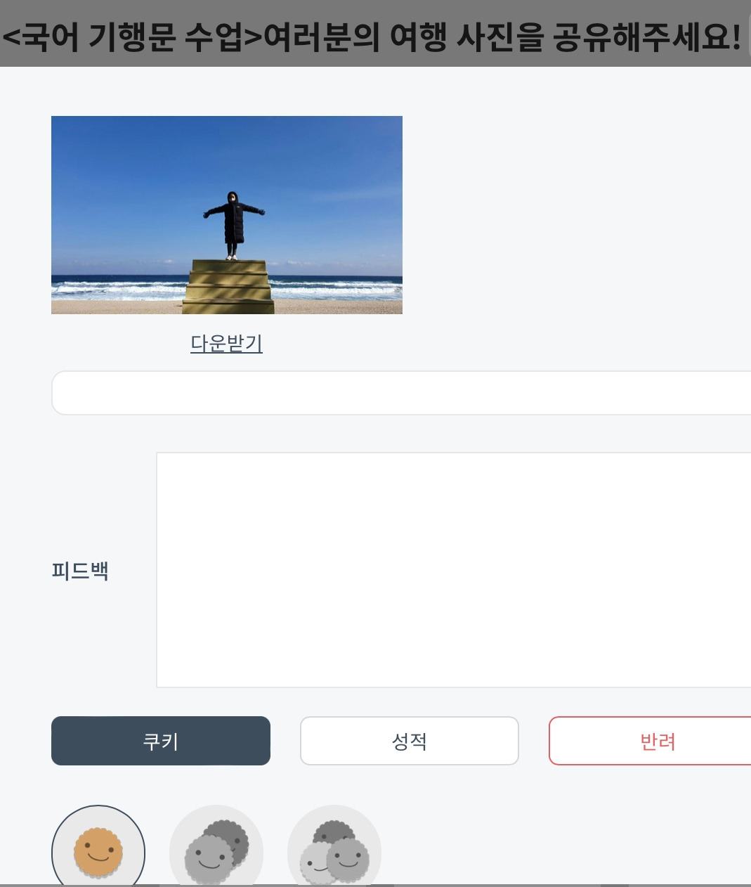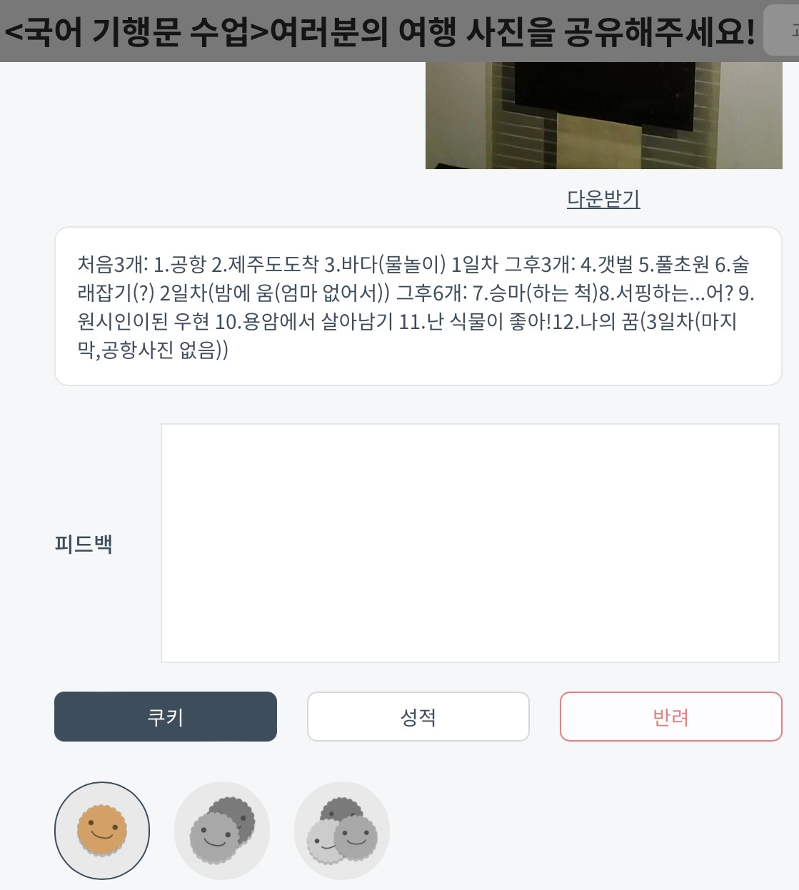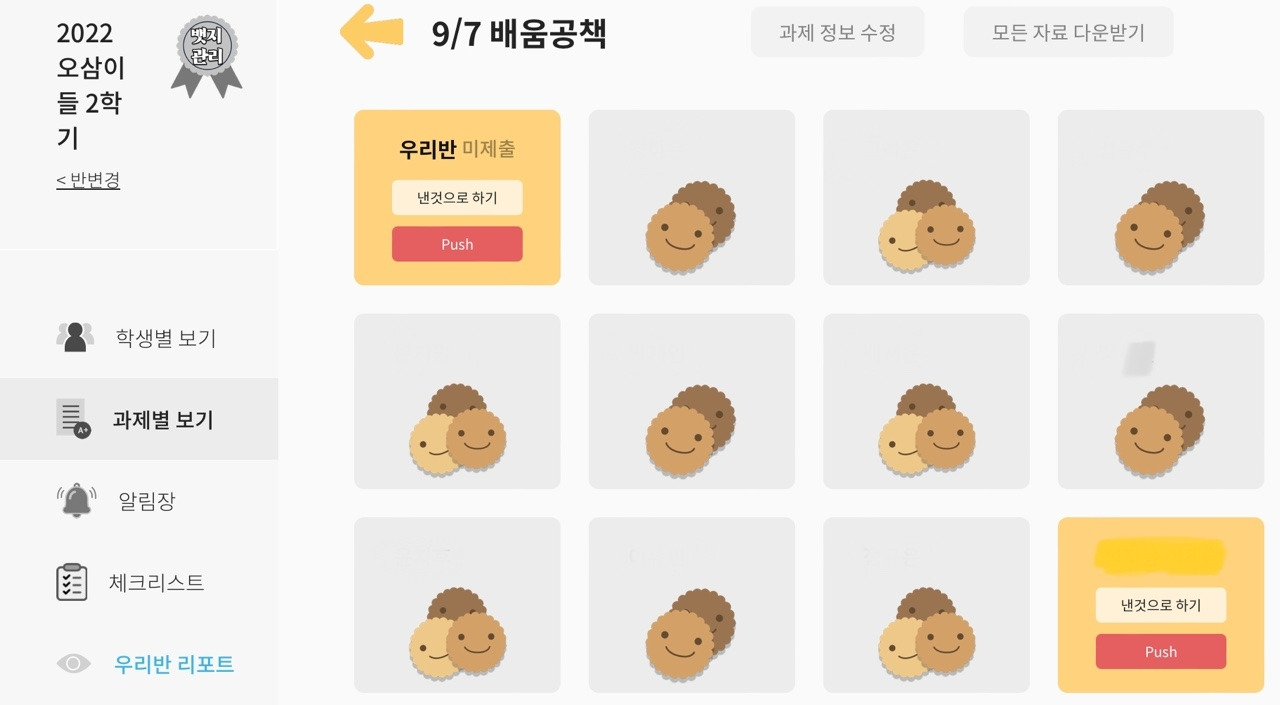 특히, 4)번 방법을 사용할 때 꼬마 선생님으로서 채점 봉사를 담당하는 학생에게 '다했니X다했어요' 쿠키 보상을 지급하는 방안도 생각해 볼 수 있다. 학생들과 채점자의 역할을 양분하면서, 교사는 부진 학생을 집중적으로 가르칠 시간을 확보한다.