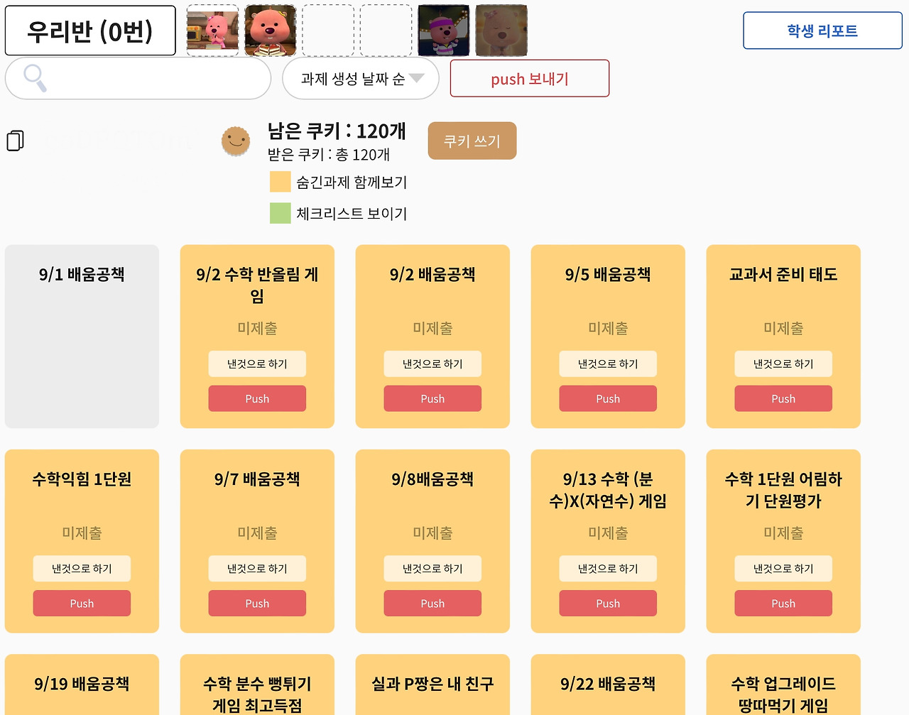 교과서 및 수업 준비 태도, 1인 1역 성실도 등 학생의 학급 학교 생활에 대한 기록과 보상에도 '다했니'를 활용했다. '체육대회에서 우리 반 모두가 사이좋게 협력하고 안전하게 활동함.', '찾아오는 음악회에서 우리 반의 감상 및 참여 태도가 우수함.'과 같이 개인이 아닌 학급 전체를 칭찬하는 경우가 있다. 그래서 학생관리 및 등록을 할 때 '우리반'이라는 계정을 따로 만들어서 쿠키를 지급해 주었다.