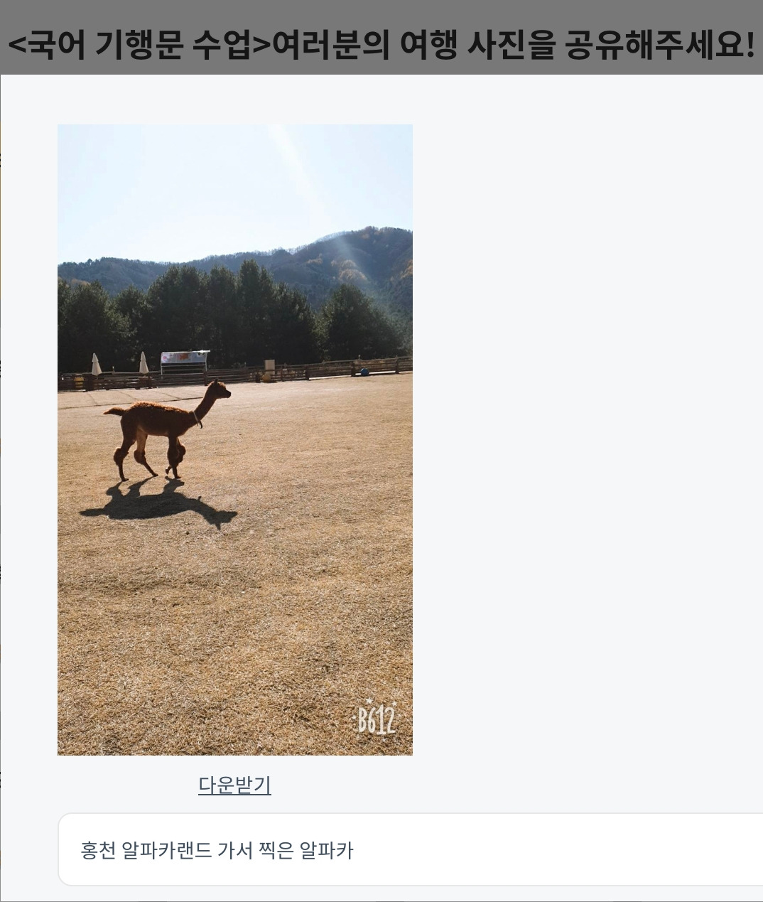- 사전 과제 / 가정에서 : 기행문 단원 들어가기 전에 학생들에게 여행과 관련된 사진 또는 영상을 ‘다했어요’에 제출하도록 안내