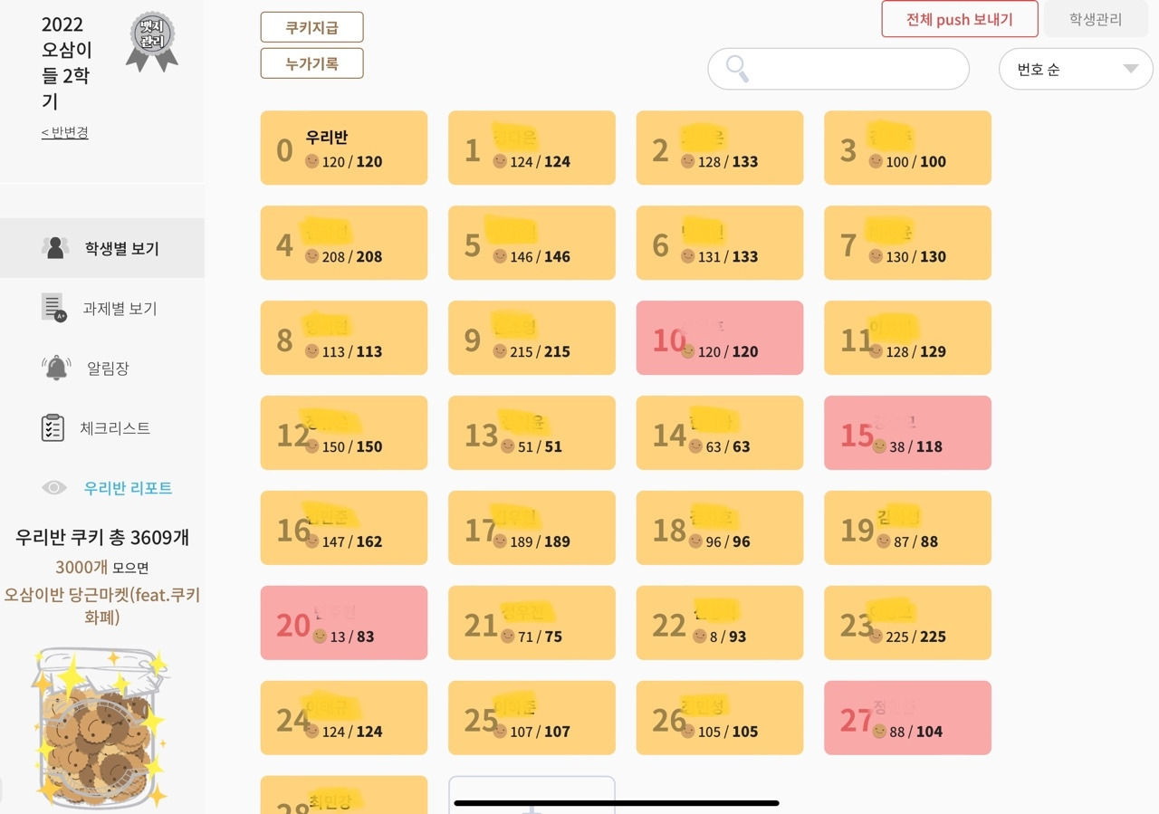 2) 과제 제출-확인-피드백 및 보상을 간편하게 할 수 있고, 개별 학생의 활동 상황이 모두 누가기록 된다. 특히 쿠키 보상을 활용하여 학생 개개인의 배움과 성장의 기록을 쌓을 수 있다.