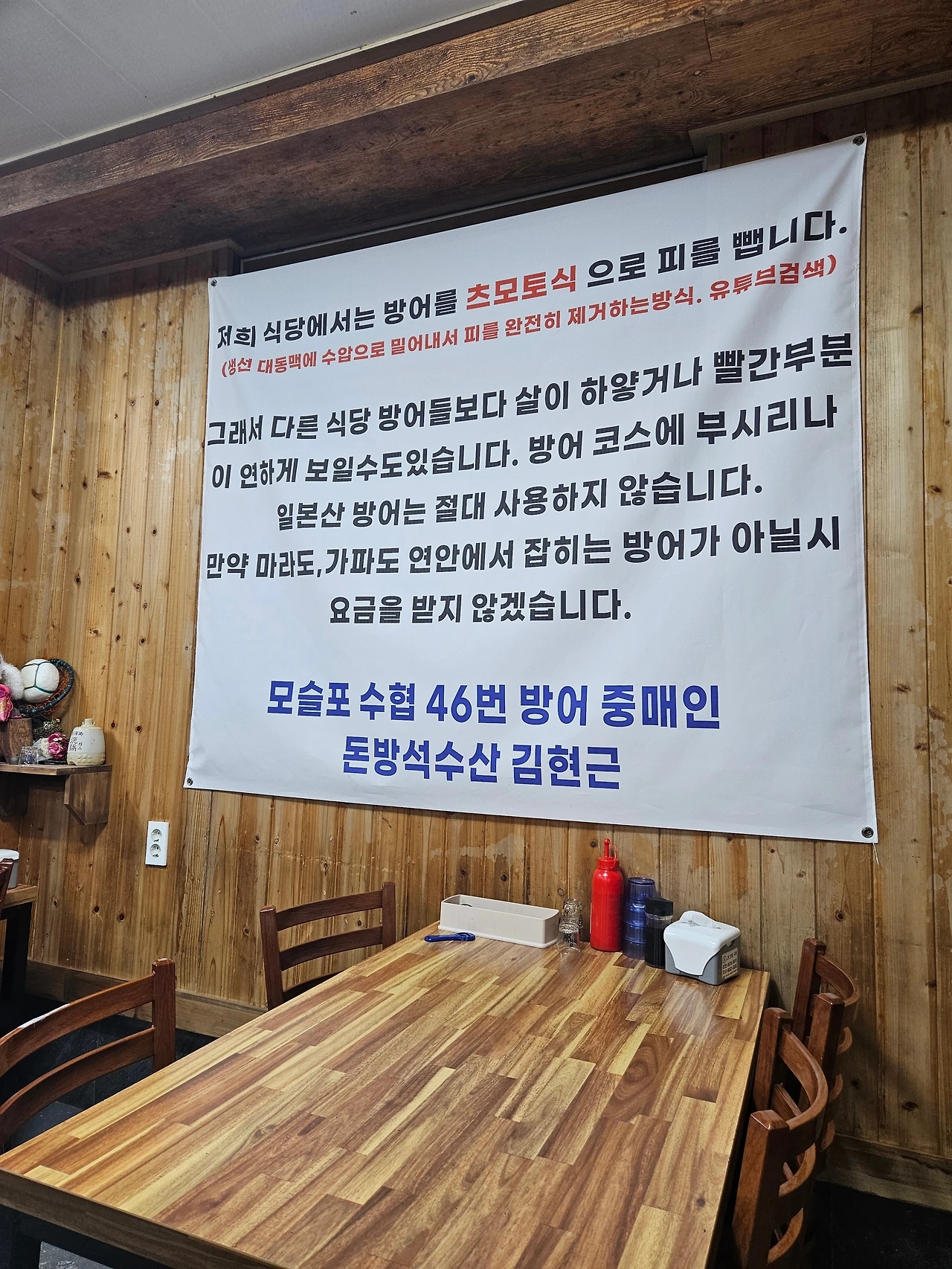 자리에 앉자마자 알았다. 맛집이라는 것을. 옆에서도 제주도 사투리, 앞뒤로도 제주도 사투리가 들렸다. 도민 맛집이라는 이야기다. 이내 나오는 코스도 다채로웠다. 방어회를 시키고 문득 우측을 보니 벽에 큰 포스터가 붙어있었다. "방어를 츠모토식으로 피를 뺍니다" "만약 마라도, 가파도 연안에서 잡히는 방어가 아닐 시 요금을 받지 않겠습니다" 전문성과 진실성을 한데 담은 포스터였다. 자신감이 느껴졌다. 방어회를 먹어보자 자신감이 진실로 다가왔다. 홍성태 교수는 브랜딩이란 고객이 '콘셉트'를 '경험'하면 완성된다고 하는데, 찰나의 순간 브랜딩을 경험한 것이다. 돈방석이라는 특이한 이름이 용서되는, 아니 이해되는 순간이었다.