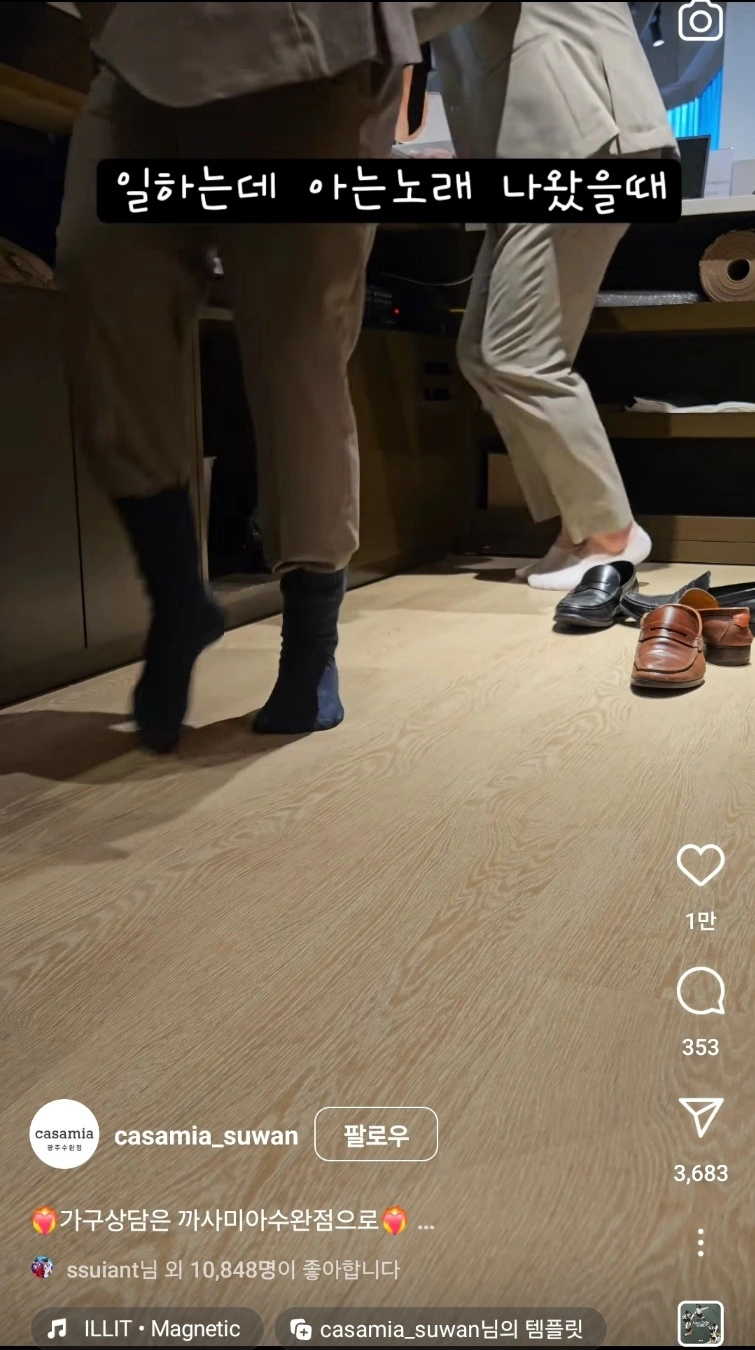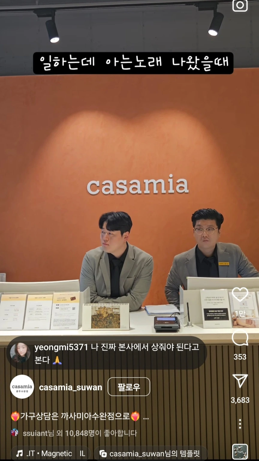 수완점 매니저 두 명이 무표정한 얼굴로 카운터에 서 있다. 신나는 노래가 나와도 무표정하다. 반전은 그들의 하체를 보여주었을 때 나타난다. 단정하고 엄숙한 표정과 뻣뻣한 상체와는 달리, 하체는 현란한 발놀림을 뽐내며 춤을 추고 있다. 심지어 정장 구두도 벗고 말이다. 사람들은 이러한 반전요소에 빵 터지며 영상을 공유한다. 공유수만 3,647회를 달성하며 까사미아 수완점은 사람들에게 한 번 방문하고 싶은 매장이 된다. 매장이 매력적이어서가 아니라 매장 직원이 매력적이어서 말이다.