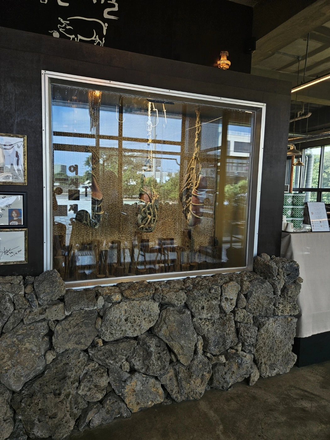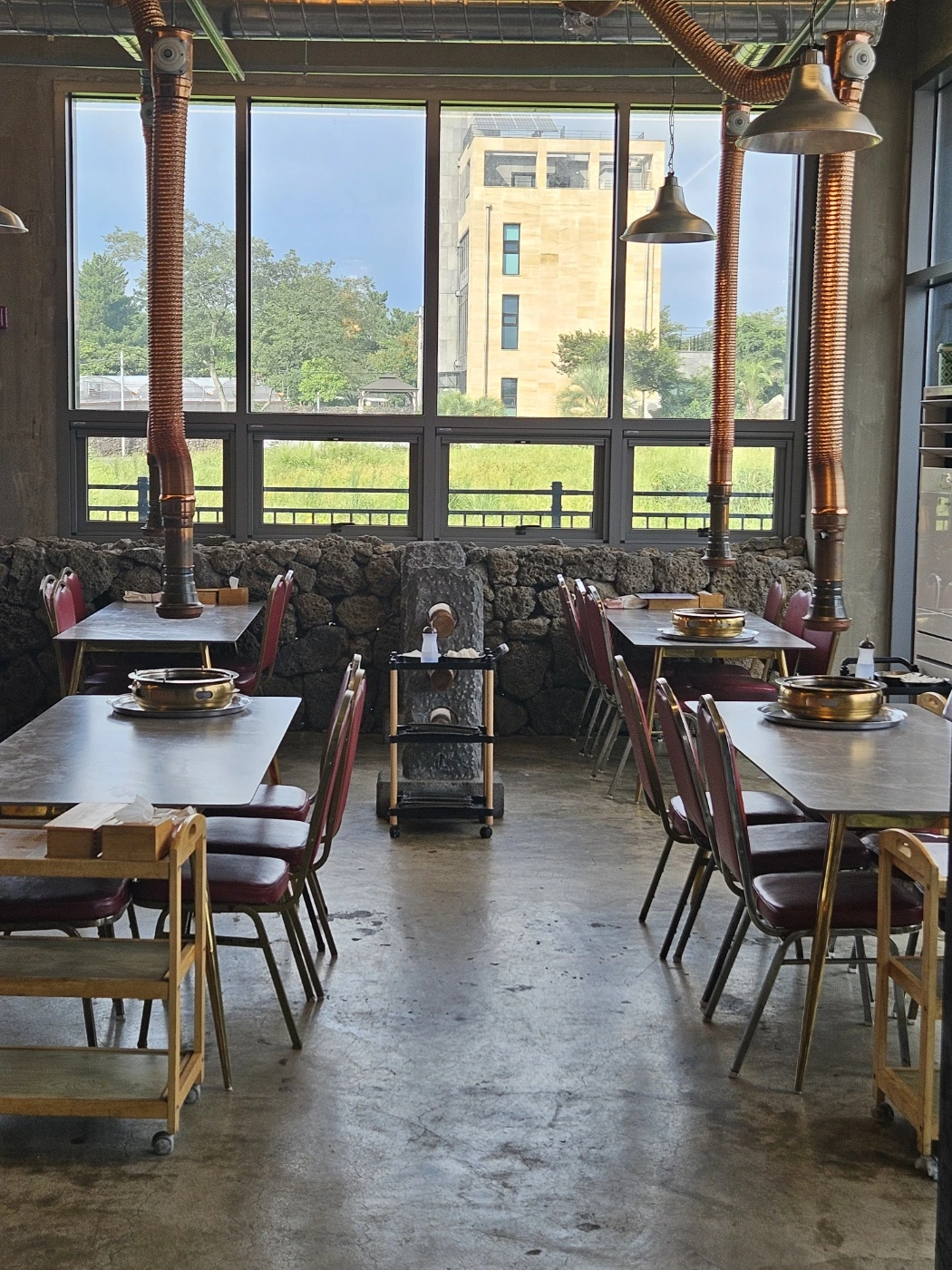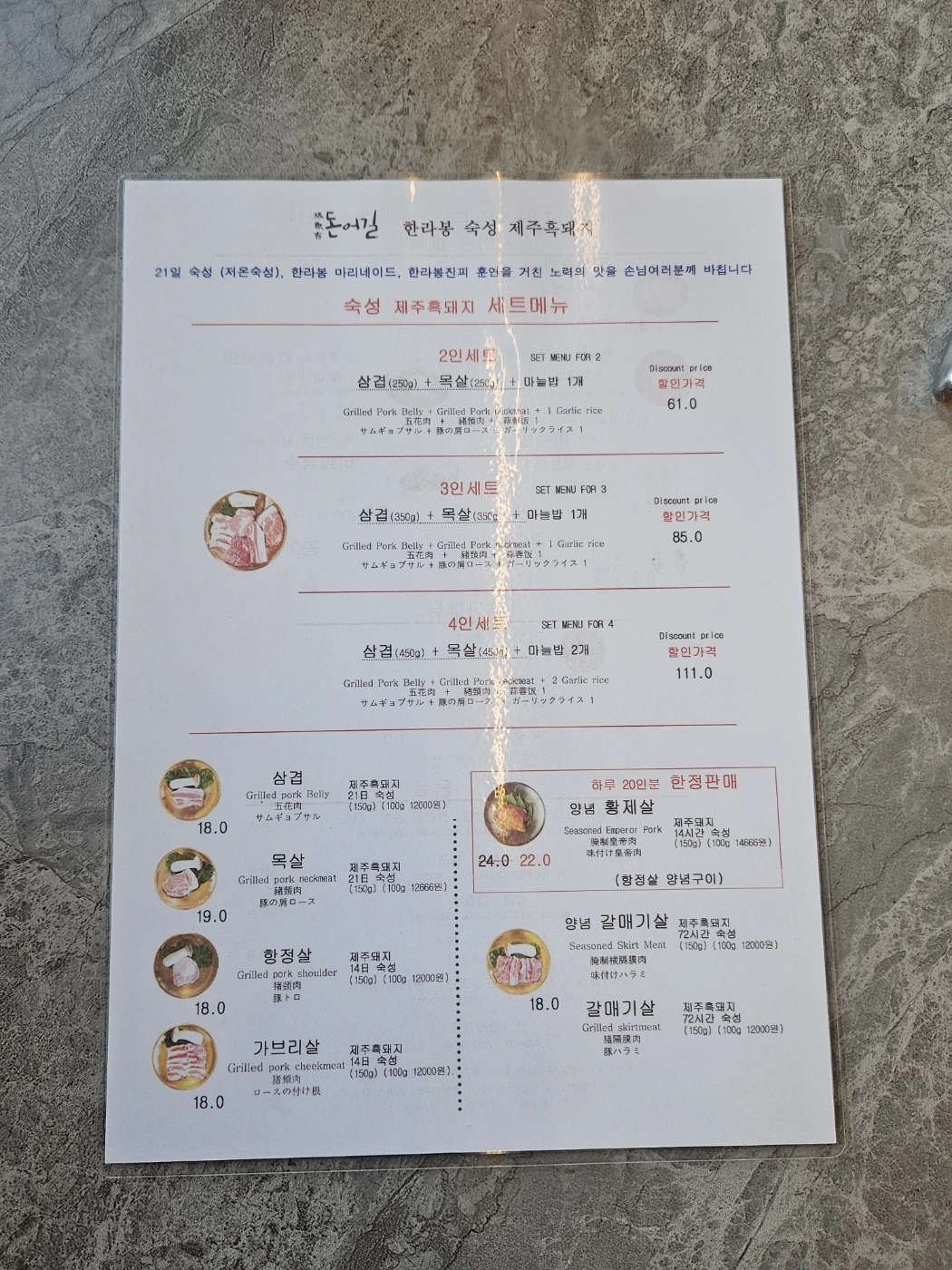 이번에 제주도에서 방문한 돈어길은 ‘숙성’에 하나를 더했다. 바로 ‘숫자’다. 14년 산 발베니, 21년 산 발렌타인처럼 비싼 위스키를 연상케 하는 ‘14일’, ‘21일’이라는 숙성일자를 메뉴명에 붙였다. 이 숫자가 나의 눈길을 사로잡았고, 수많은 숙성 흑돼지 전문점 중 돈어길을 선택하게 되었다. 매장 문을 열자마자 보이는 숙성 고기는 메시지를 직관적으로 드러내고 있었다. 또한 제주에서만 경험할 수 있는 가게라는 것을 직관적으로 보여주는 현무암 벽과 세 개의 나무기둥으로 이루어진 제주도 특유의 대문인 정낭으로 테이블을 구분한 것도 인상적이었다. 웨이팅이 긴 집은 역시 디테일이 달랐다.