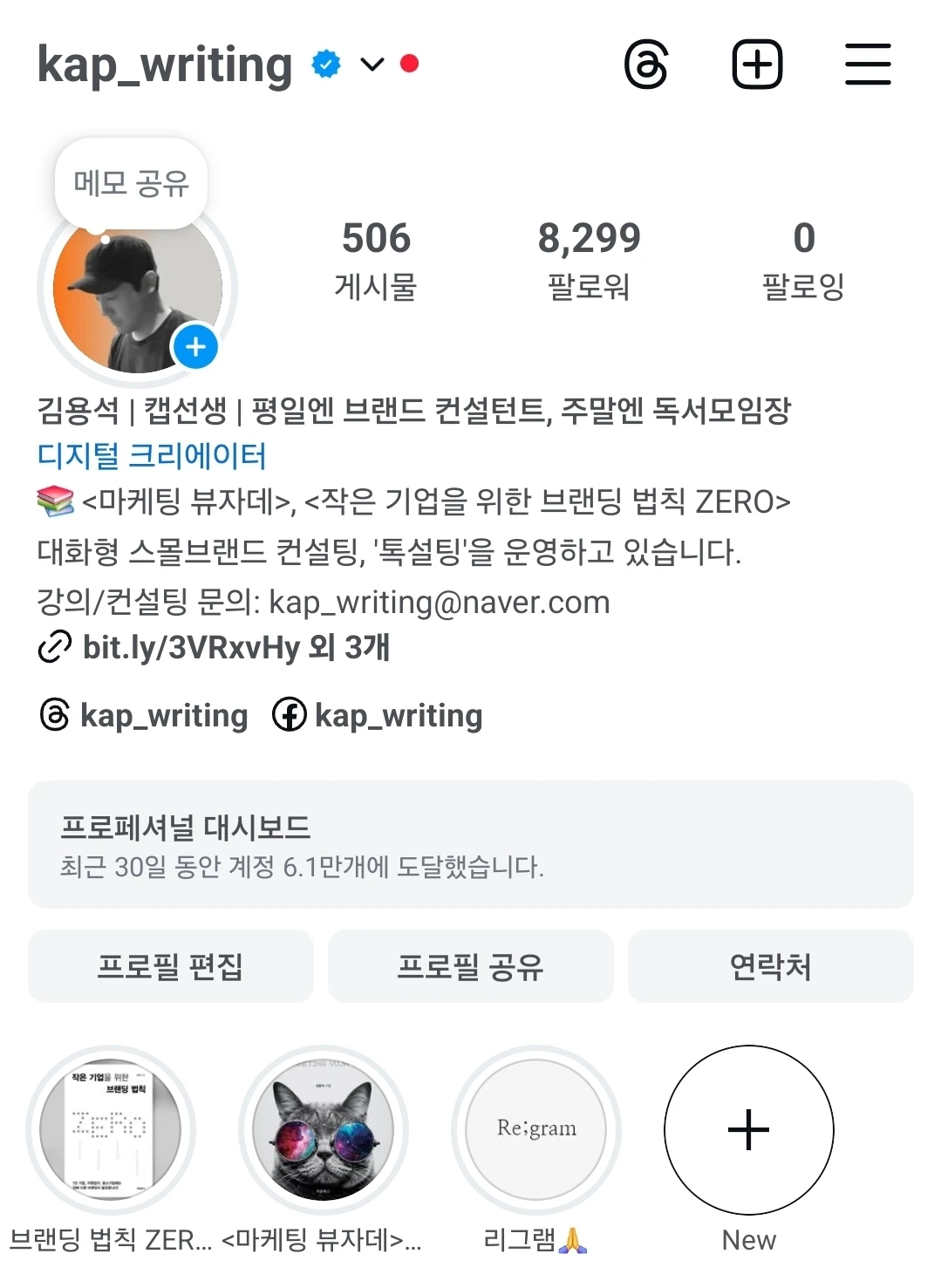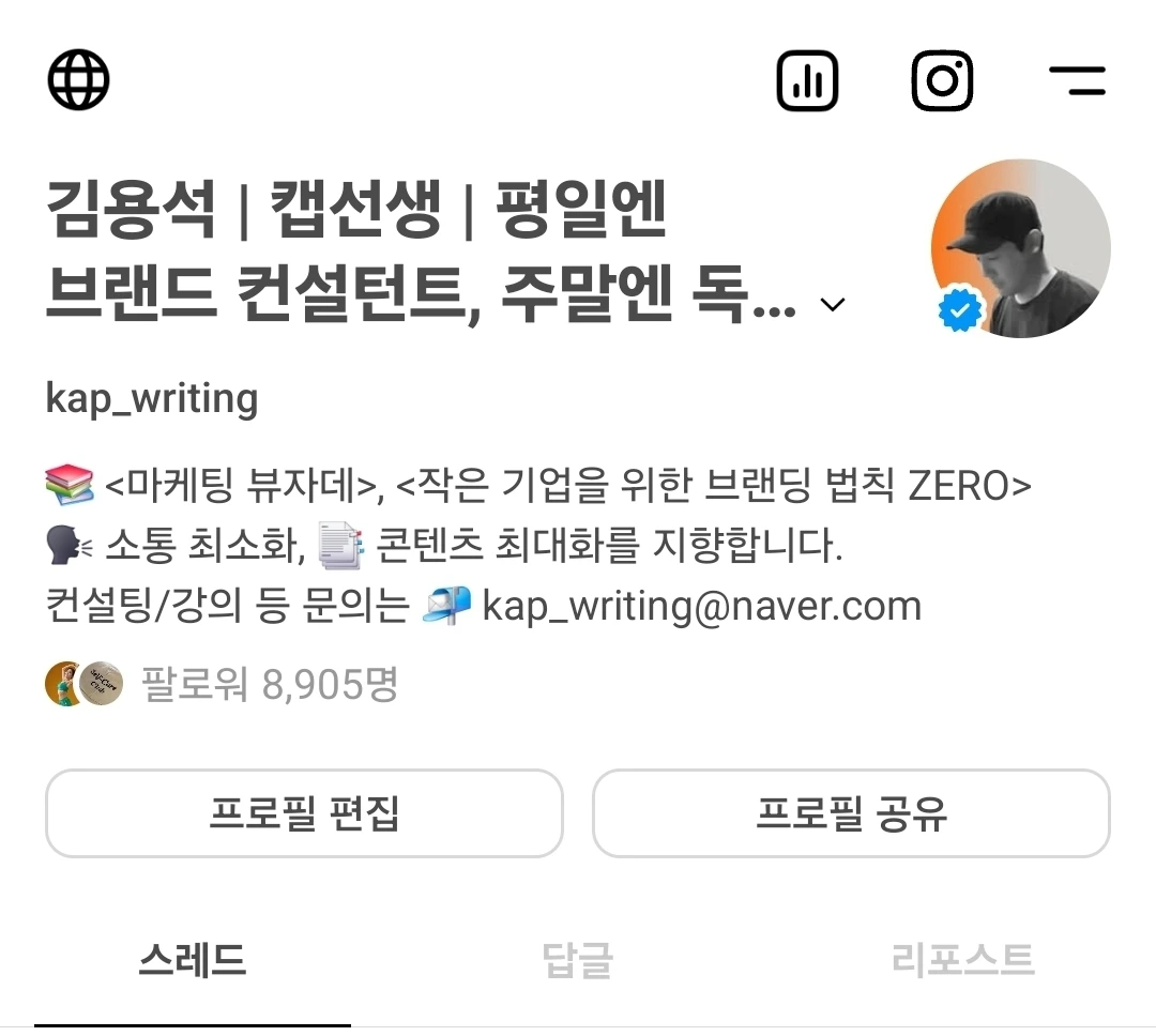 ‘캡선생’이라는 부캐로 인스타그램 팔로워 8천여 명, 스레드 9천여 명, 브런치 구독자 900명을 얻게 되었다. 그리고 <마케팅 뷰자데>, <작은 기업을 위한 브랜딩 법칙 ZERO>라는 책을 내며 세상에 내가 누구인지, 무엇을 하는 사람인지 알릴 수 있었다. 더 나아가 매주 TBN 한국교통방송에 출연하며 어릴 적 꿈꾸던 라디오 출연도 경험하게 되었다.