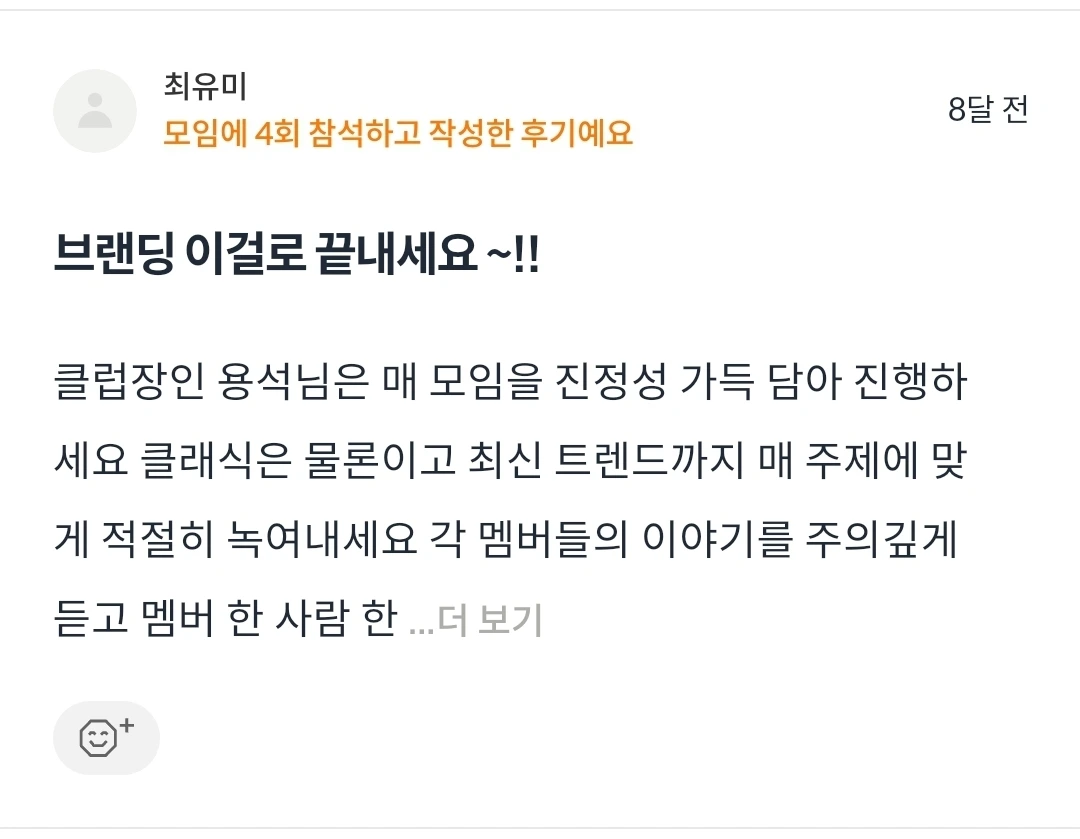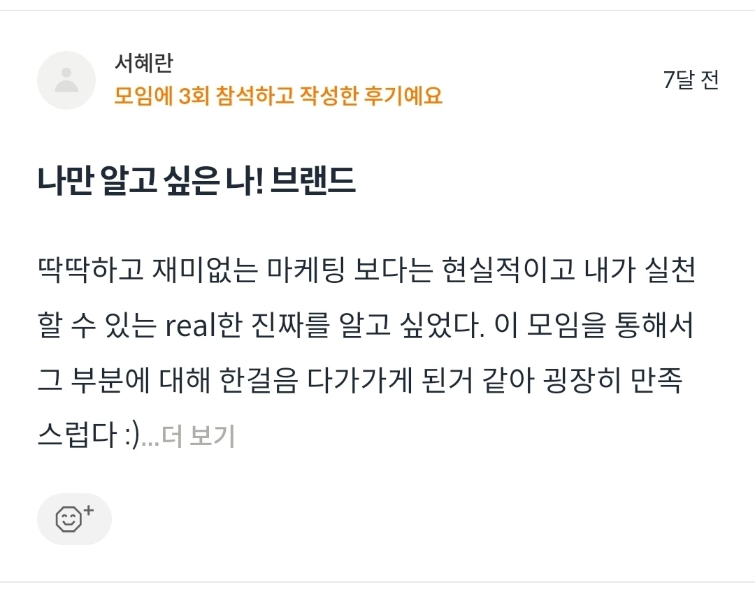 이 모든 과정에서 겪은 시행착오와 경험을 나누고 싶었다. 그래서 독서모임 트레바리에서 <나, 브랜드>라는 이름의 모임을 열게 되었다. 이 모임에서는 '나'를 더욱 잘 이해하여 나만의 강점을 세상에 발현할 수 있는 방법을 다양한 책과 대화를 통해 알아가고 있다. 단순히 책을 읽고 토론하는 자리가 아니라, 각자의 경험과 고민을 나누며 실질적인 답을 찾아가고 있다.