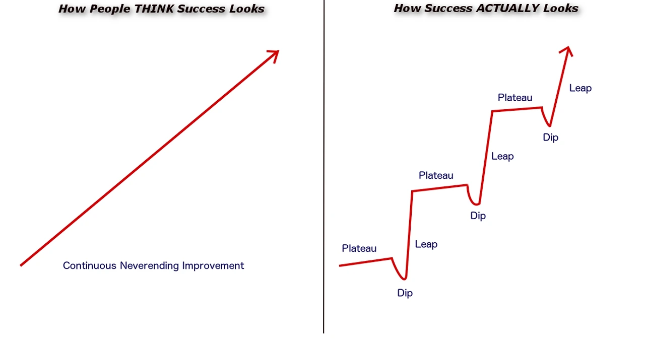 위 그림과 같이 대다수가 생각하듯이 성공은 직선으로 올라가는 것이 아닌 계단식으로(심지어 때로는 아래로 떨어지며) 상승하는 곡선이다.