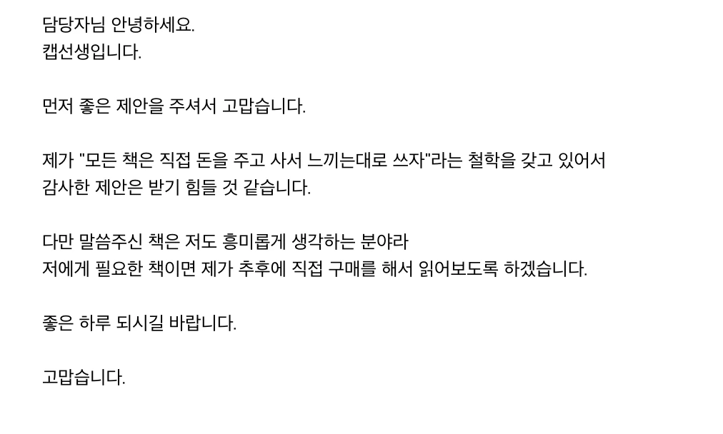 그래도 나의 원칙을 지키는 것이 맞다고 판단하여 홍보 담당자분에게는 정중하게 거절 의사를 밝힘과 동시에 내가 직접 돈 주고 구매를 하겠다고 이야기를 했다.