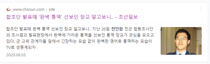 전 세계의 이목이 쏠렸던 중대한 사건인만큼 해군뿐 아니라 필요한 부분에 있어 다른 군 인력도 투입이 되었는데, 공군 어학장교도 여기에 포함되었다. 내가 복무할 당시만 해도 국방부 장관 통역은 물론이고 대통령 군사 통역도 공군 어학장교가 전담했기에 천안함의 외신 브리핑도 공군 어학장교가 담당을 하게 되었다. 국방부에 소속되어 있던 선배와 동기들이 외신 브리핑을 위한 자료 번역을 했고, 합동조사단 발표 때는 공군 어학장교의 에이스였던 조군호 중위가 통역을 담당하게 되었다.