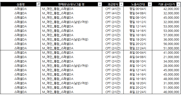 디지털 광고는 다양한 방식으로 과금이 되는데 스페셜DA의 경우 시간당 정해진 비용을 지불하는 CPT(Cost Per Time) 방식이다. 시간대별로 다소 차이는 있으나 2시간에 수천만 원대라고 생각하면 된다. 이렇게나 비싼 광고 상품을 수많은 회사가 구하지 못해 발을 동동 구르고 있다. 특히 많은 유저들이 네이버를 활용하는 평일 출퇴근 시간과 점심시간대의 광고구좌는 더더욱 말이다. 그래서 이러한 광고 상품을 대신 구매하여 판매하는 미디어렙(Media Representative) 회사의 직원들은 마치 가수 아이유 콘서트의 티켓팅을 하듯 매주 스페셜DA팅(?)을 하고 있다.