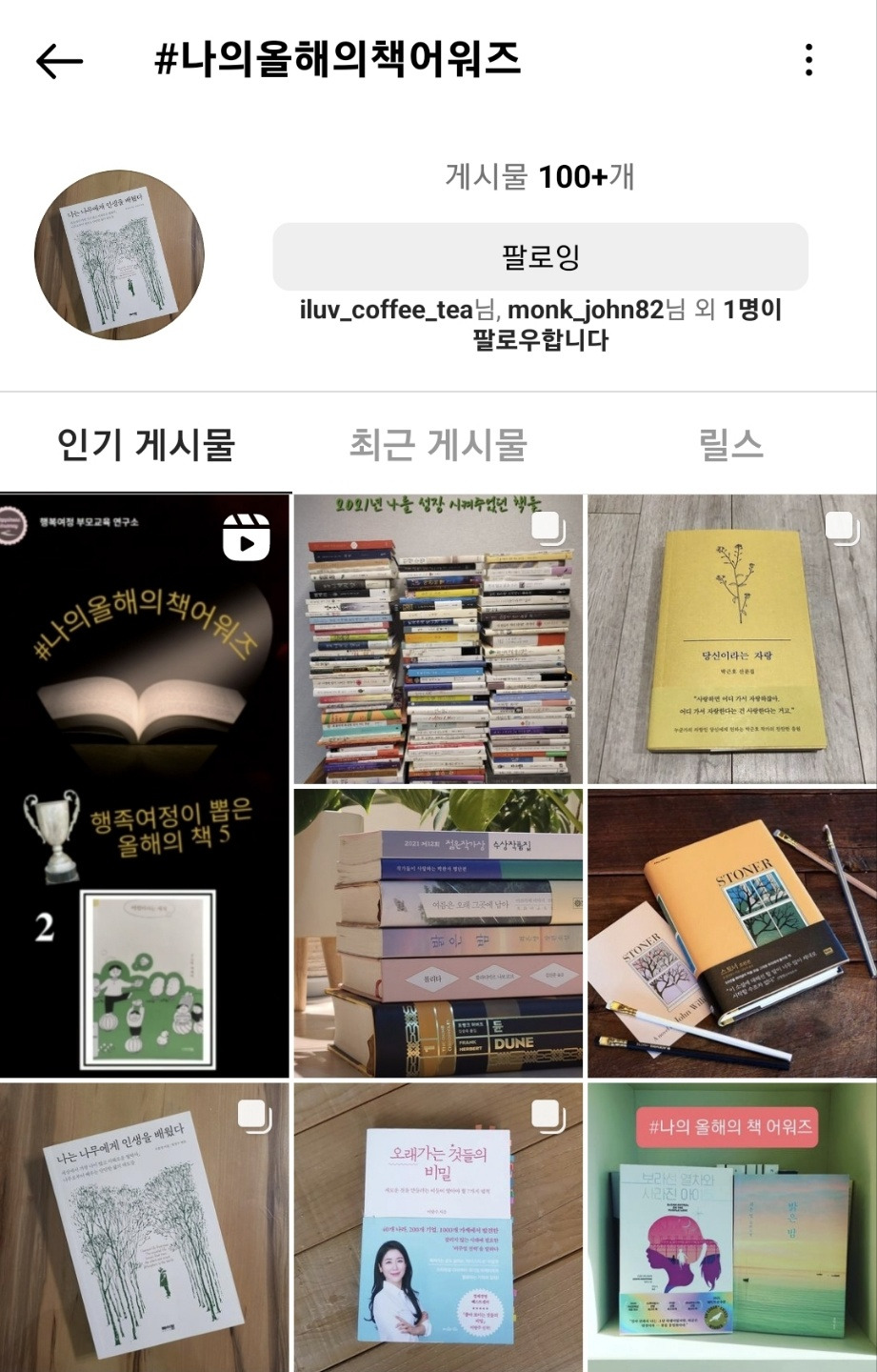 이렇게 권위 있는 단체가 선정한 추천도서와 일반 대중이 선정한 추천도서가 만족스럽지 않다 보니 또 다른 종류의 추천도서가 있었으면 하는 바람이 있었다. 책을 즐겨 읽는 사람이 솔직하게 본인이 가장 좋았던 책을 추천하는 그런 추천도서 말이다. 그래서 2019년부터 책을 좋아하는 사람들이 한 해를 돌아보면서 가장 좋았던 책을 서로에게 추천할 수 있는 장을 인스타그램에 마련해 보았다. 릴레이식으로 나의 올해의 책을 꼽아보는 #나의올해의책어워즈 캠페인이 바로 그것이다.
