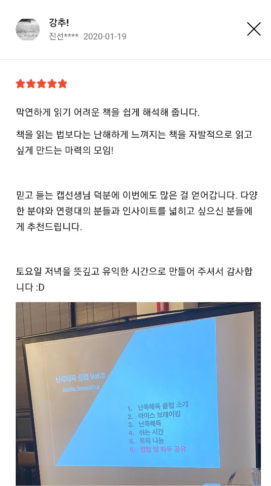이런 생각을 바탕으로 <난독해독클럽>은 어려운 책을 쉽게 설명해 주는 '해독 타임'과 이러한 이해를 바탕으로 참여자들이 책과 관련해서 자기의 생각을 이야기하는 '해석 타임'으로 구성했다. <난독해독클럽>이 추구하는 '책을 읽지 않아도 읽은 것처럼 말할 수 있는 모임'이 완성되었다.