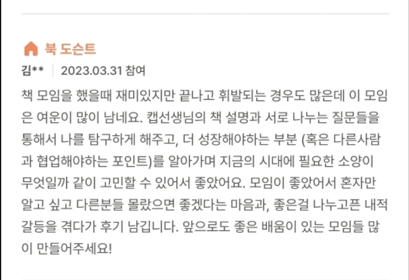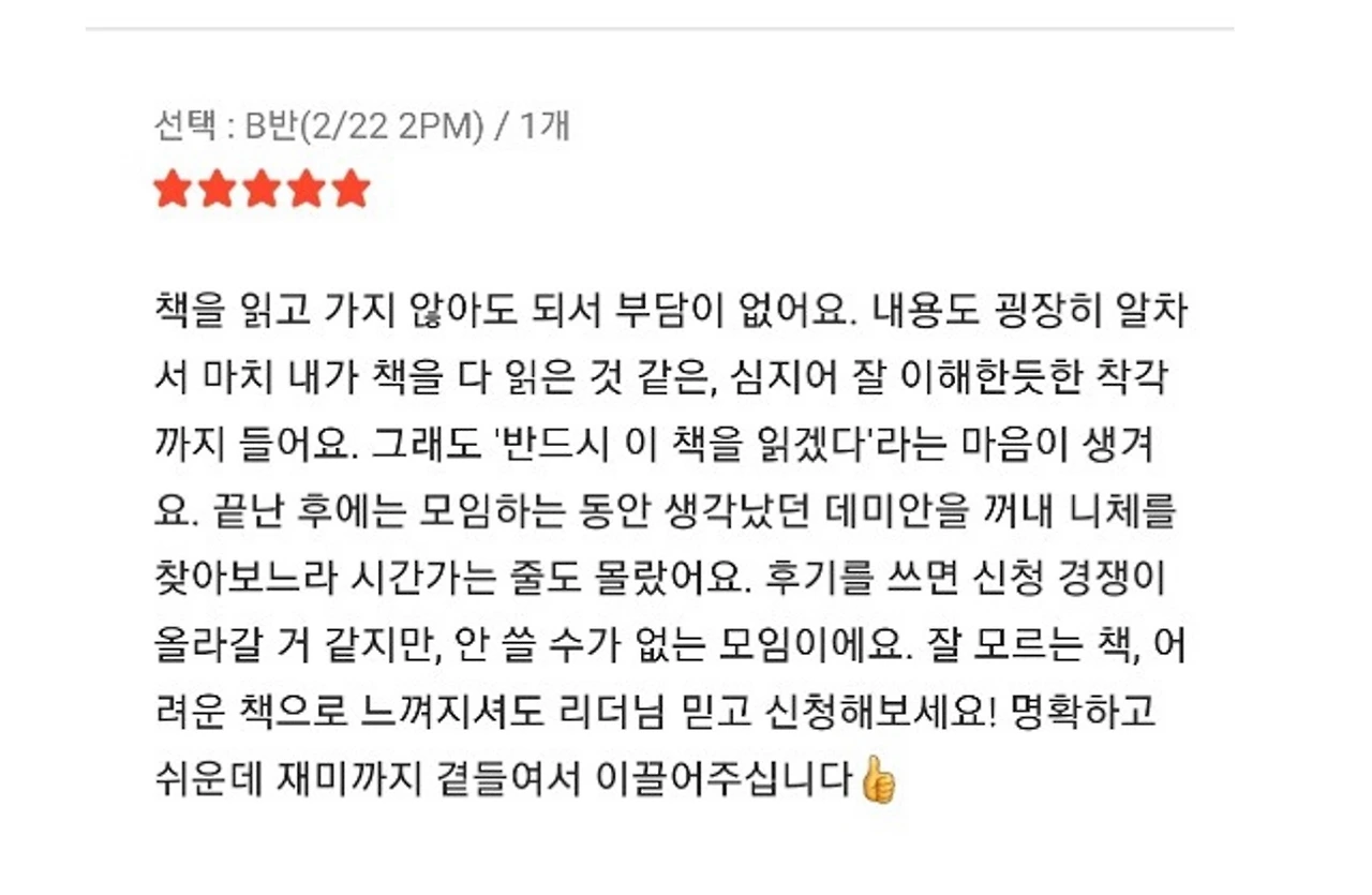 위 이미지처럼 후기를 남겨주신다면야 너무나도 감사하다다. 이보다 더 좋은 마케팅은 없을 테니 말이다. '나만 알고 싶은 모임'이라는 평은 모임장이 받을 수 있는 최고의 칭찬이자 다른 사람들도 참여버튼을 누를 수밖에 없게 만드는 마법의 단어이기 때문이다. 문제는 정말로 나만 알고 싶어서 그 누구에게도 알리지 않는 분들이다.
