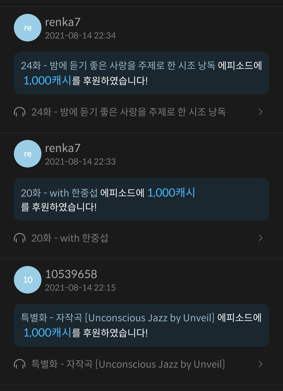 그리고 매니악한 콘텐츠일수록 팬덤의 크기는 작지만 강도는 커 보였다. 이런 걸 누가 듣지 싶은 콘텐츠에는 대부분의 경우 많은 댓글이 달려있고 후원하기도 꽤나 활성화되어 있었다. 이 경우에는 '유대감'이 후원으로 이어지지 않았나 싶다.